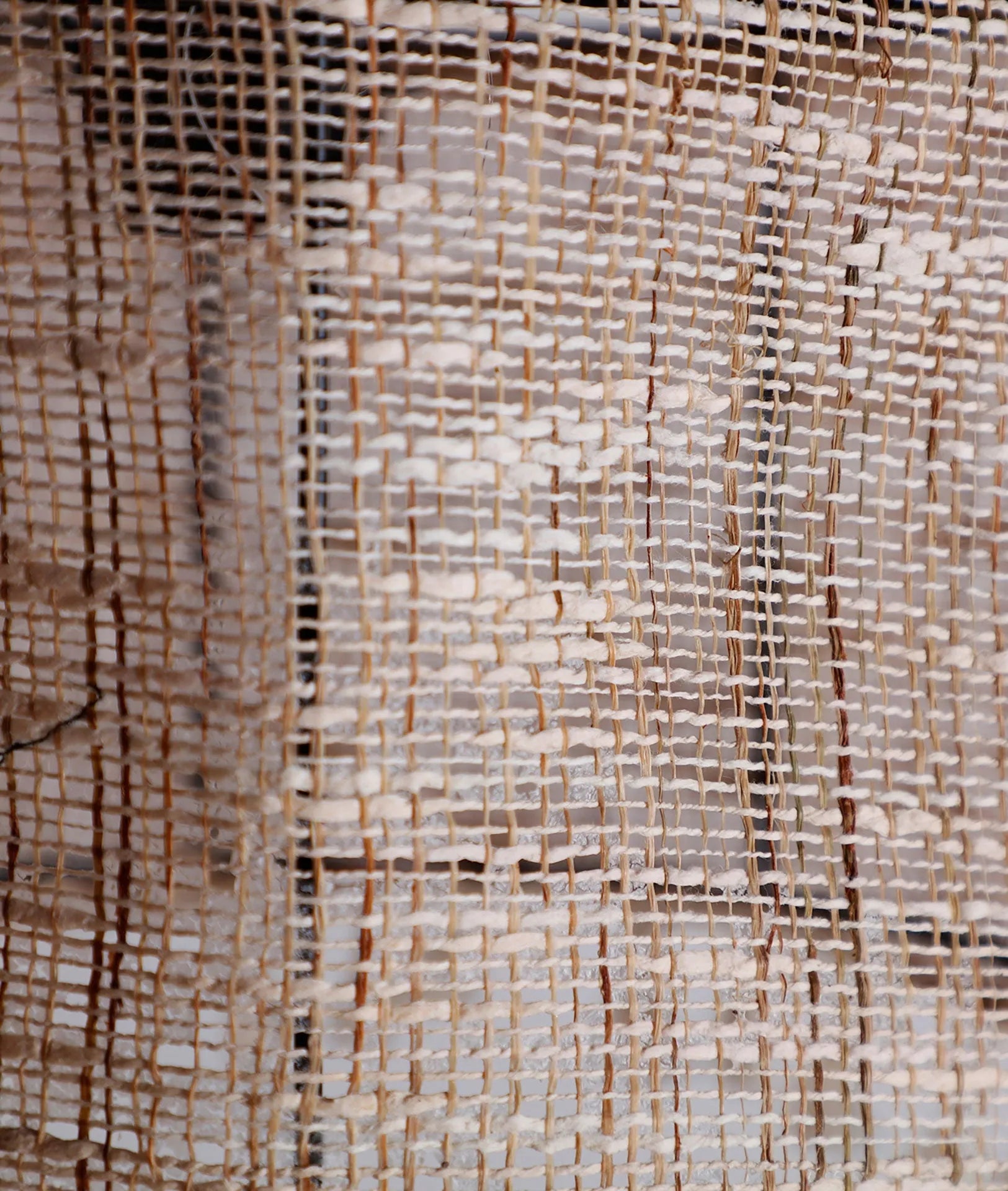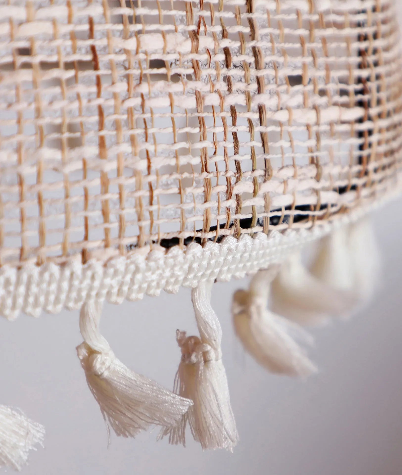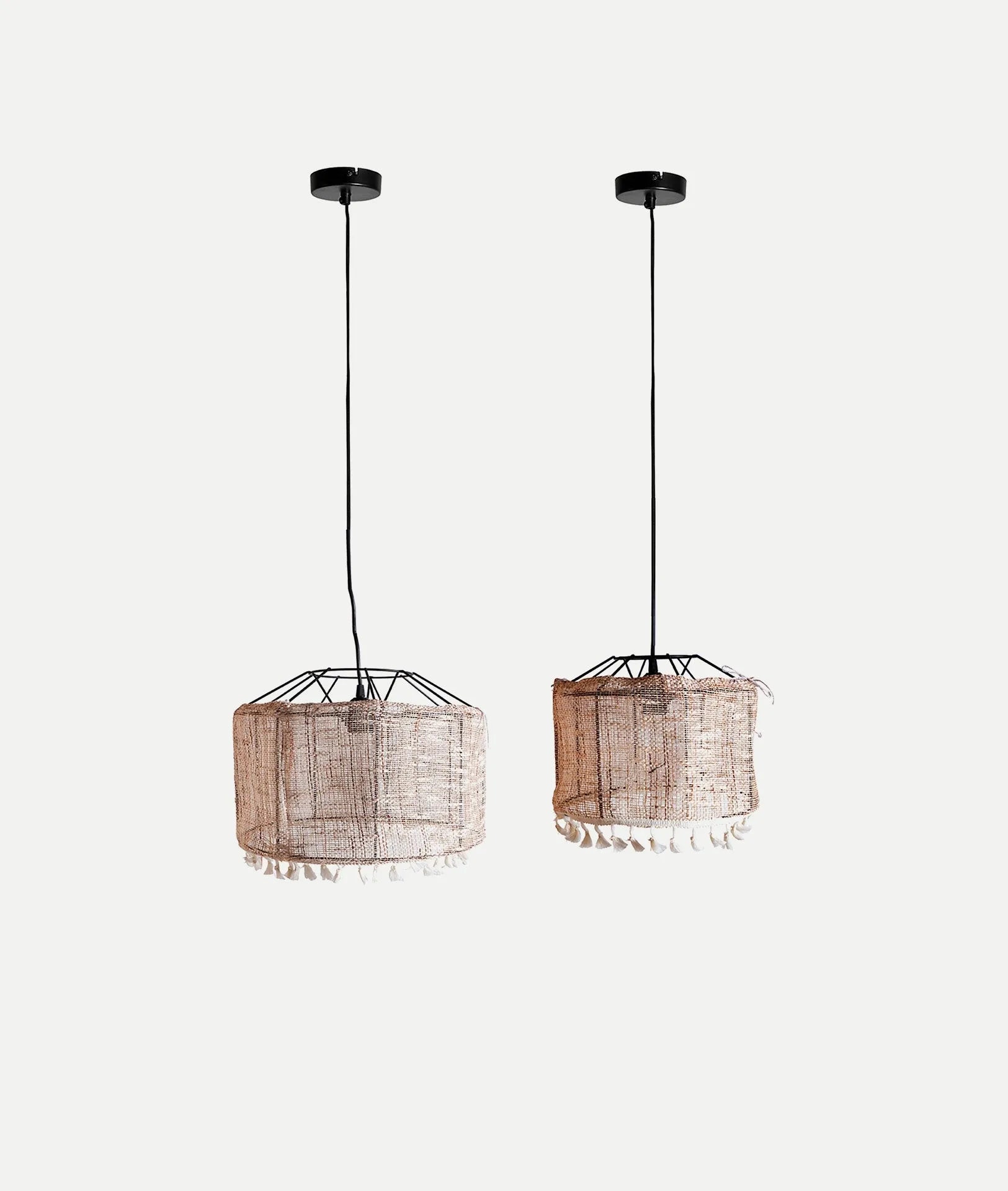 They are made with an iron frame covered in a delicate layer of light brown linen, adorned with fine thread pendants. The set includes two lamps of different sizes, perfect for creating a balanced and harmonious composition.