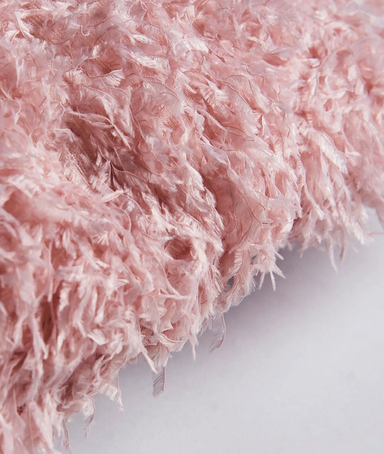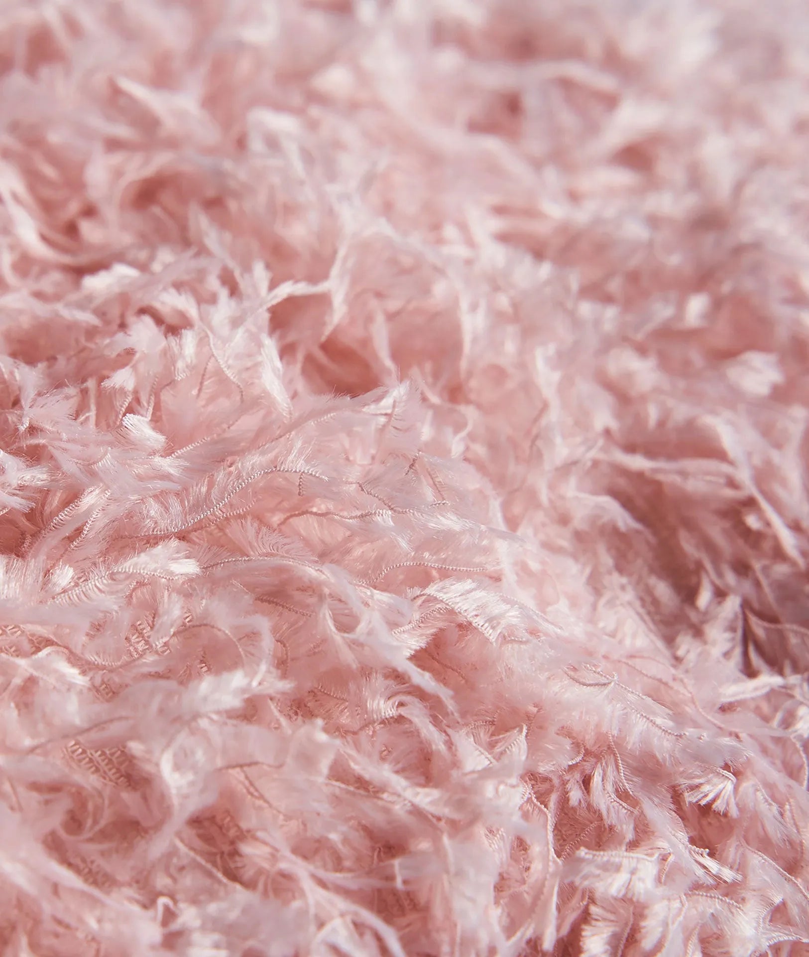 Made of pink polyester, it has a square shape and a synthetic fur finish that makes it especially pleasant to the touch.