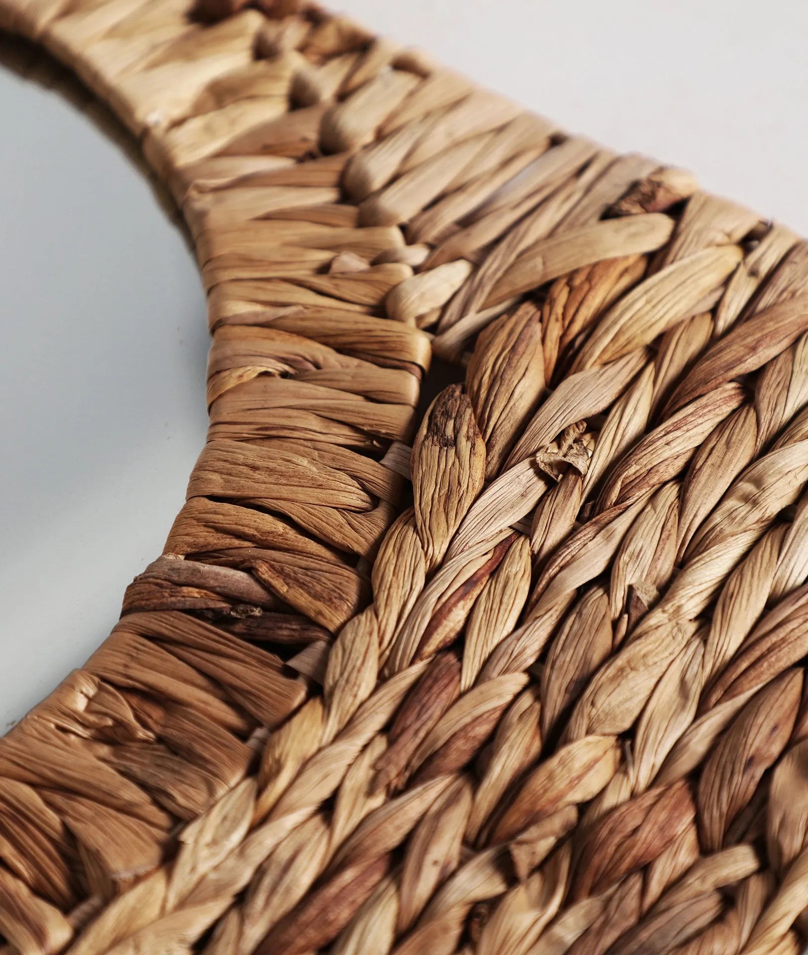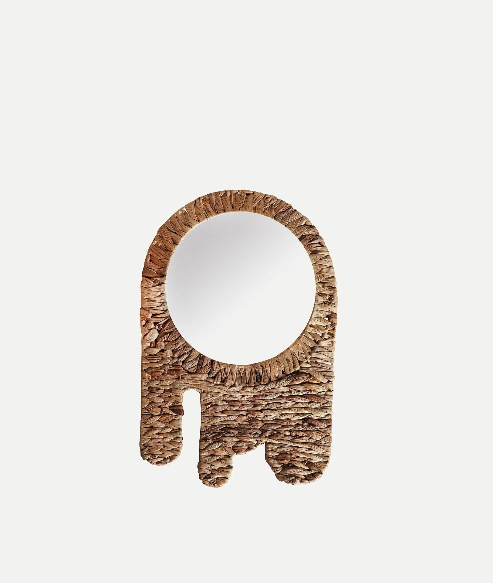 Irregular Blair boho-style mirror made of straw in brown combined with mirror and iron