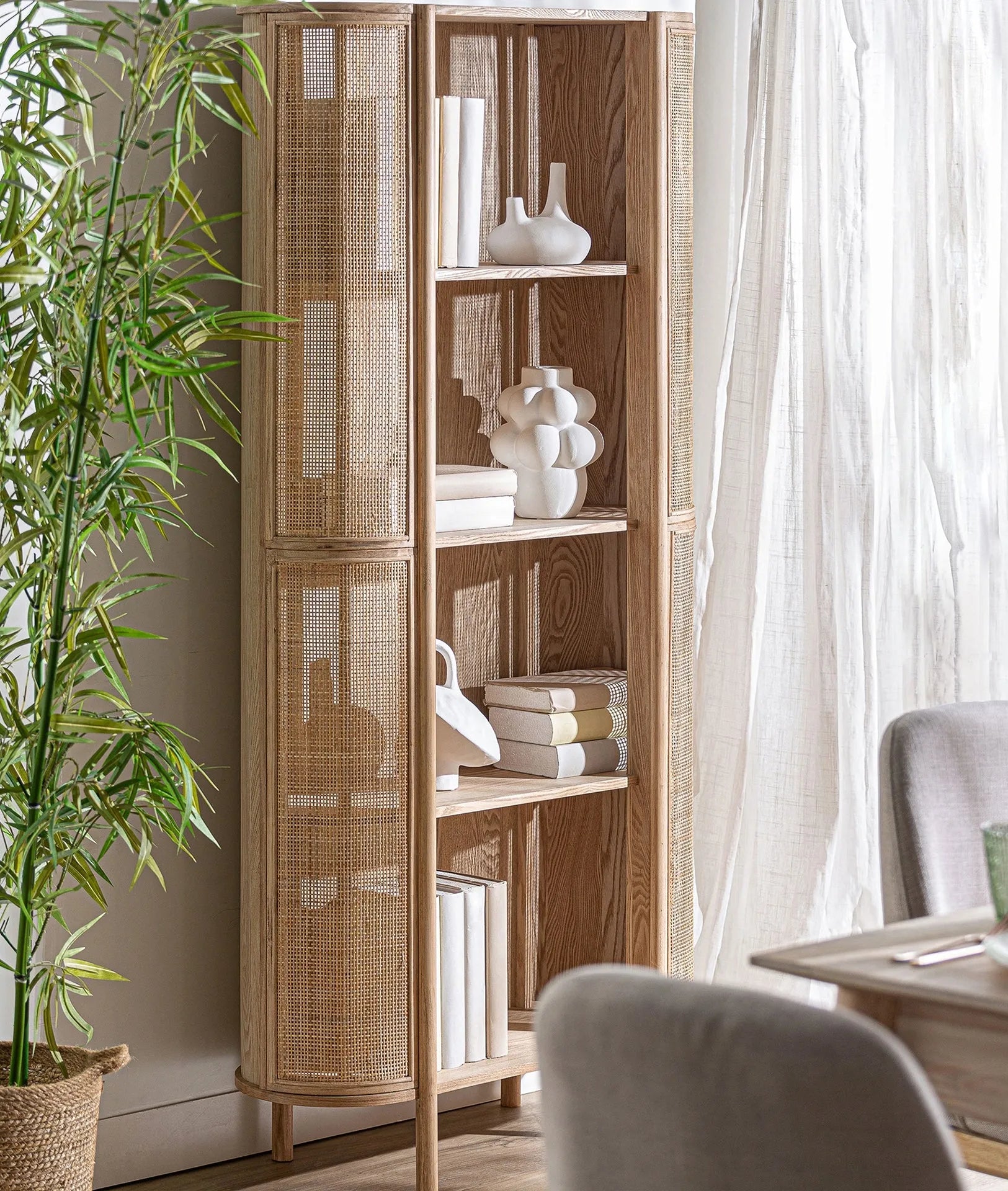 Ikla oval bookcase in brown, Nordic style. Made of MDF wood combined with ash wood and rattan.