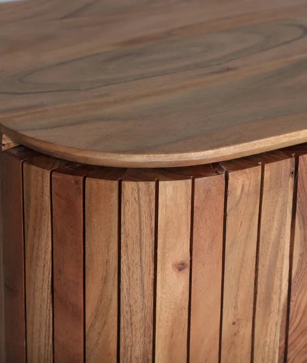 Brown acacia wood combined with MDF. Compact, vintage/functional style.