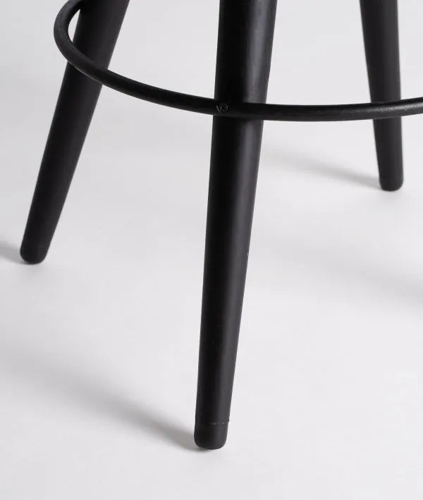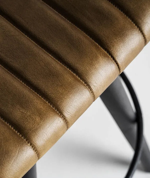 Green leather high stool (Note: Material color is brown) with a black metal tripod base, measuring 42 x 42 x 59 cm. Its industrial design and padded seat with piping give it a modern style, perfect for kitchen counters or bar areas. This stool offers a combination of comfort and aesthetics, ideal for those looking for a functional and decorative piece in contemporary spaces. The metal frame ensures optimal stability and durability.