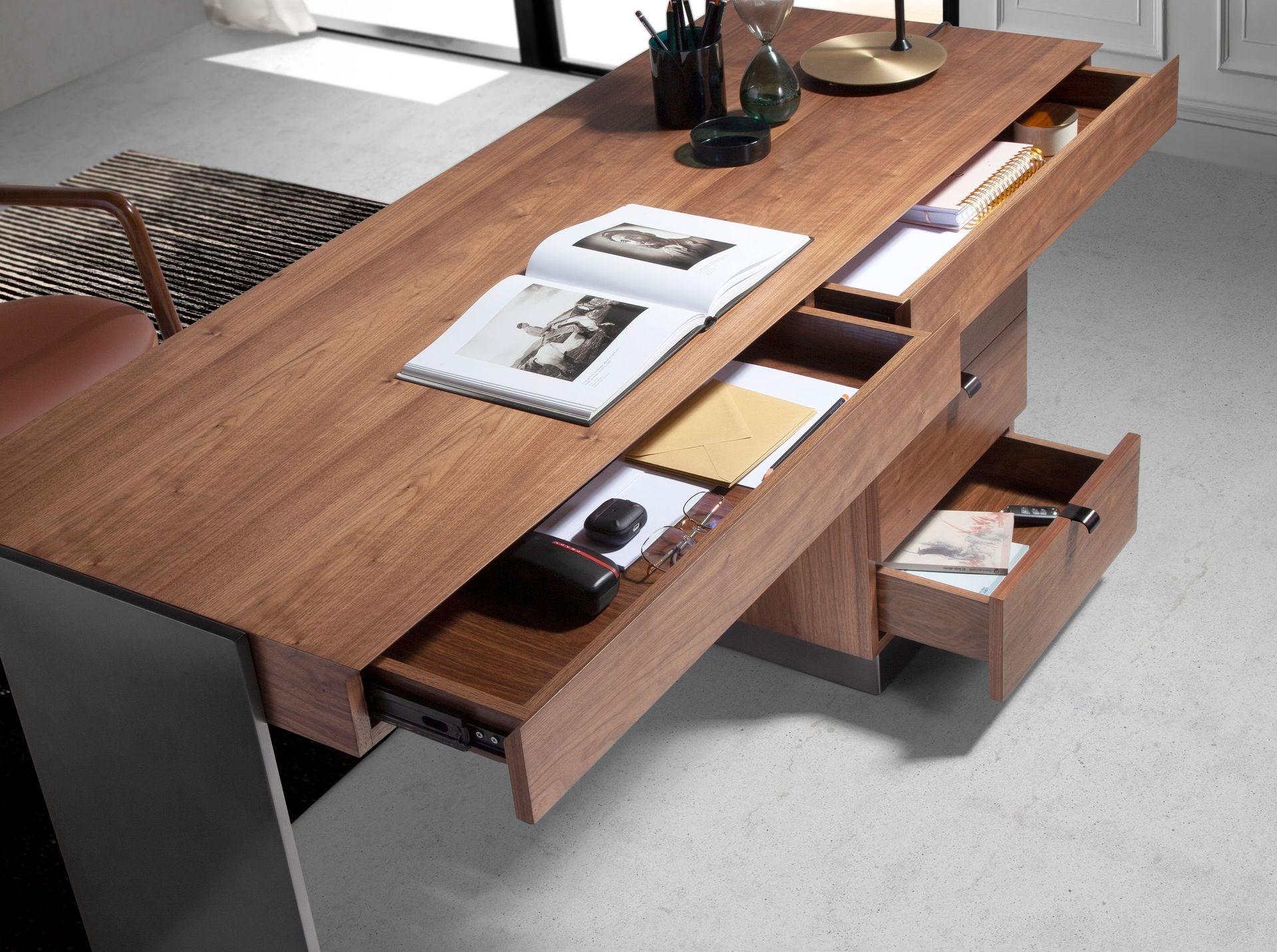 Walnut and darkened polished steel desk