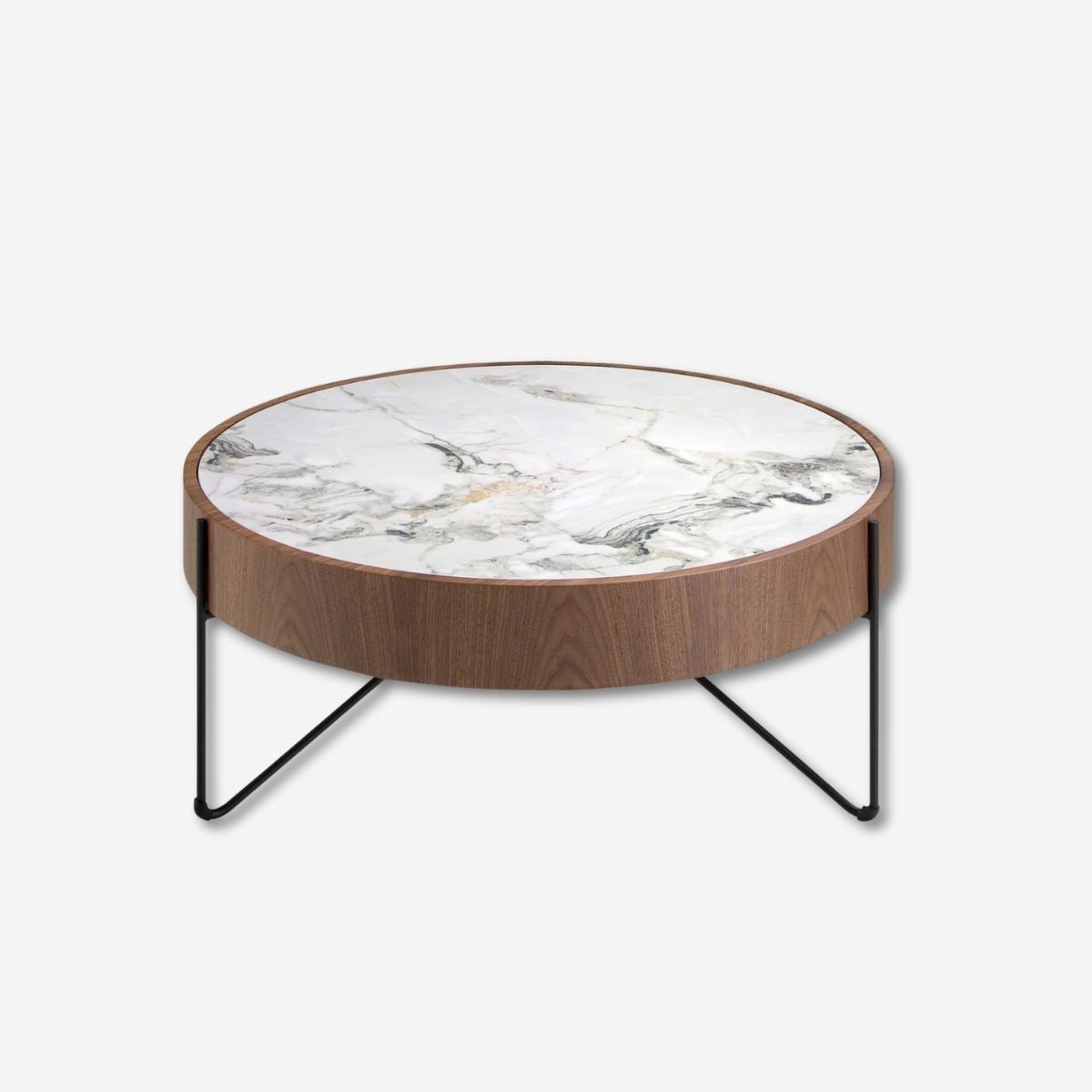 Round coffee table in porcelain marble, walnut and black steel