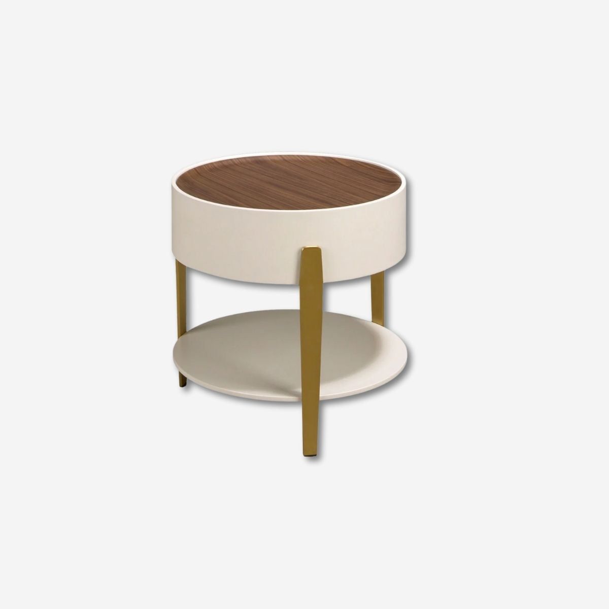 Round corner table in walnut, beige wood and polished gold steel