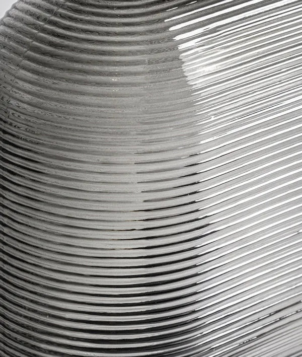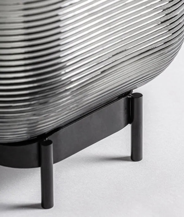 Minimalista y sofisticada, la lámpara de mesa LYRA destaca por su cristal gris traslúcido grabado con líneas horizontales, que difunden la luz y crean una atmósfera serena.