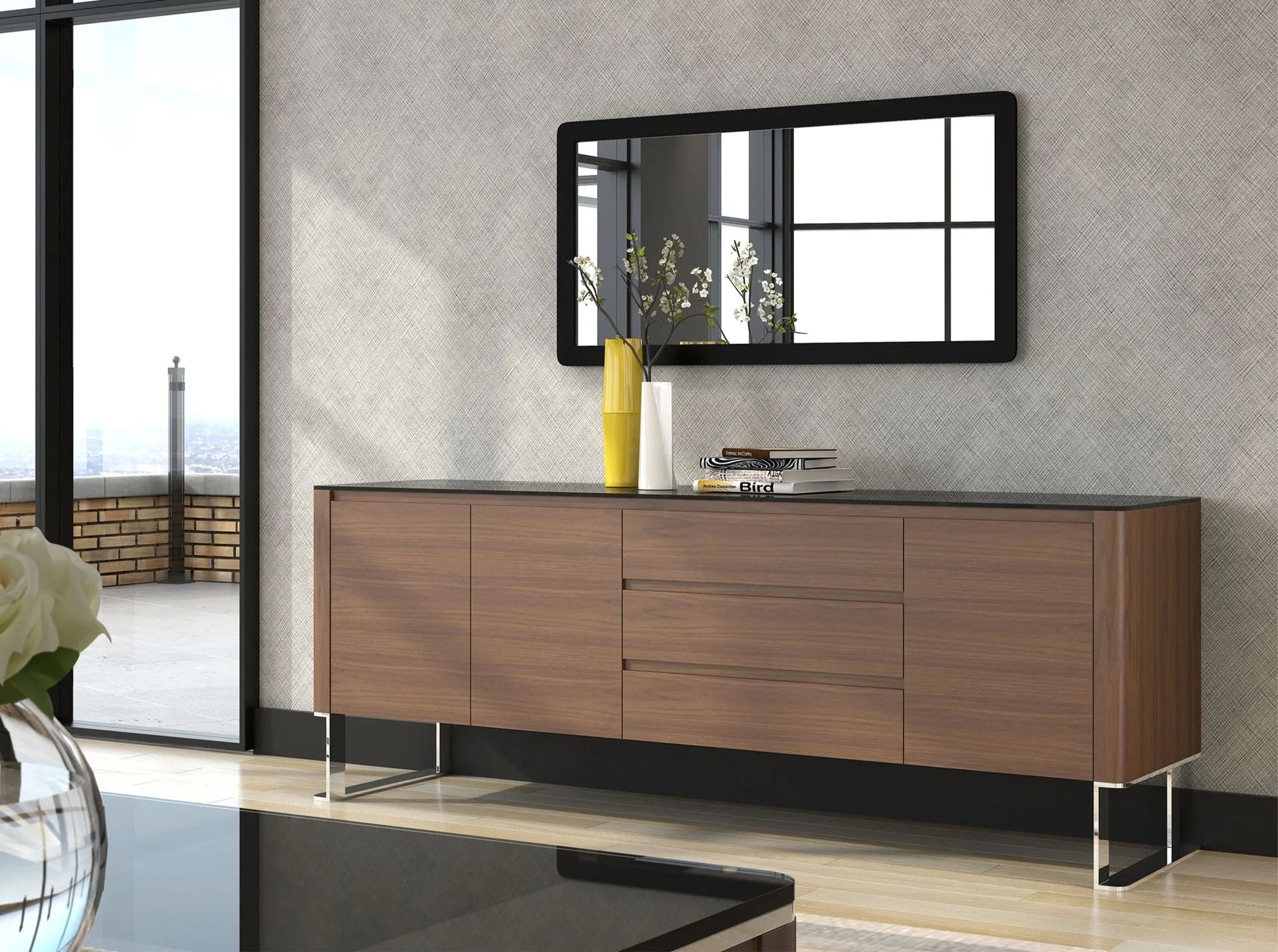 Este aparador de diseño moderno destaca por su equilibrio entre elegancia y funcionalidad, combinando la calidez del nogal con la luminosidad del acero cromado.