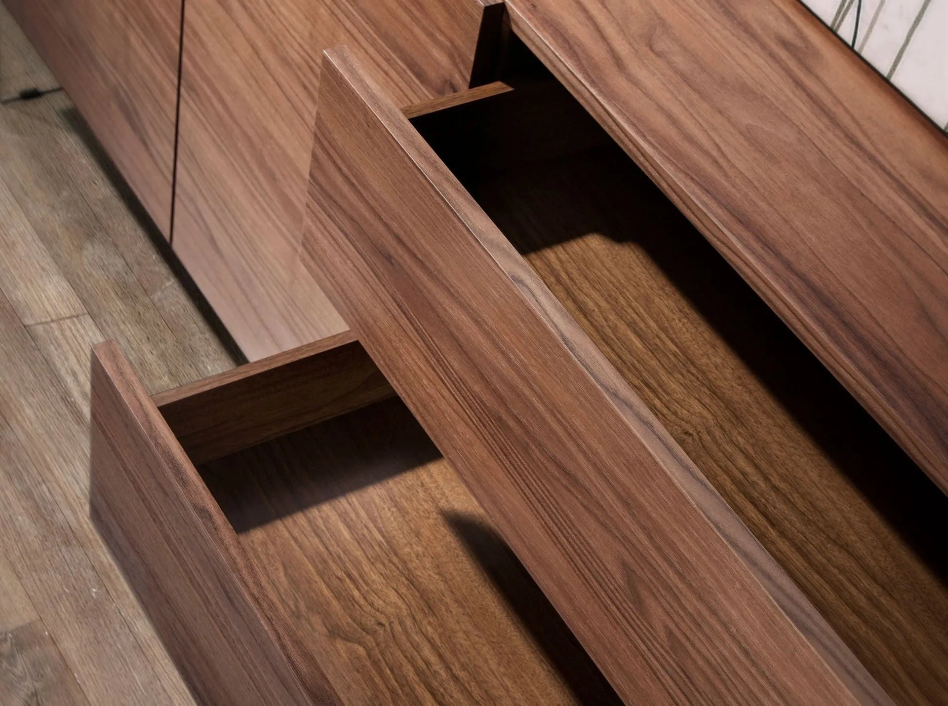 Diseño moderno en nogal natural con patas de cristal templado. Dispone de 3 cajones y 2 puertas con apertura uñero y cierre soft-closing, ofreciendo gran capacidad de almacenaje con un estilo elegante y funcional.