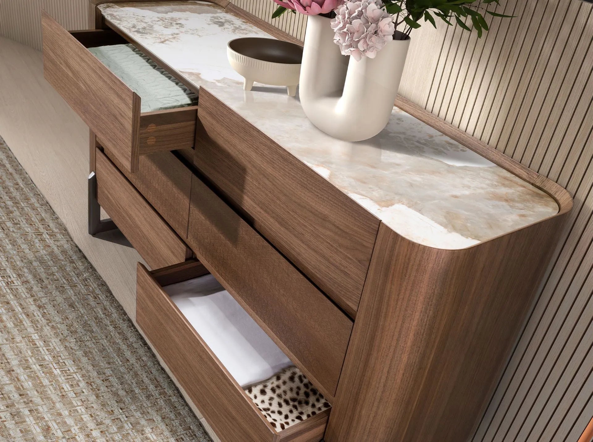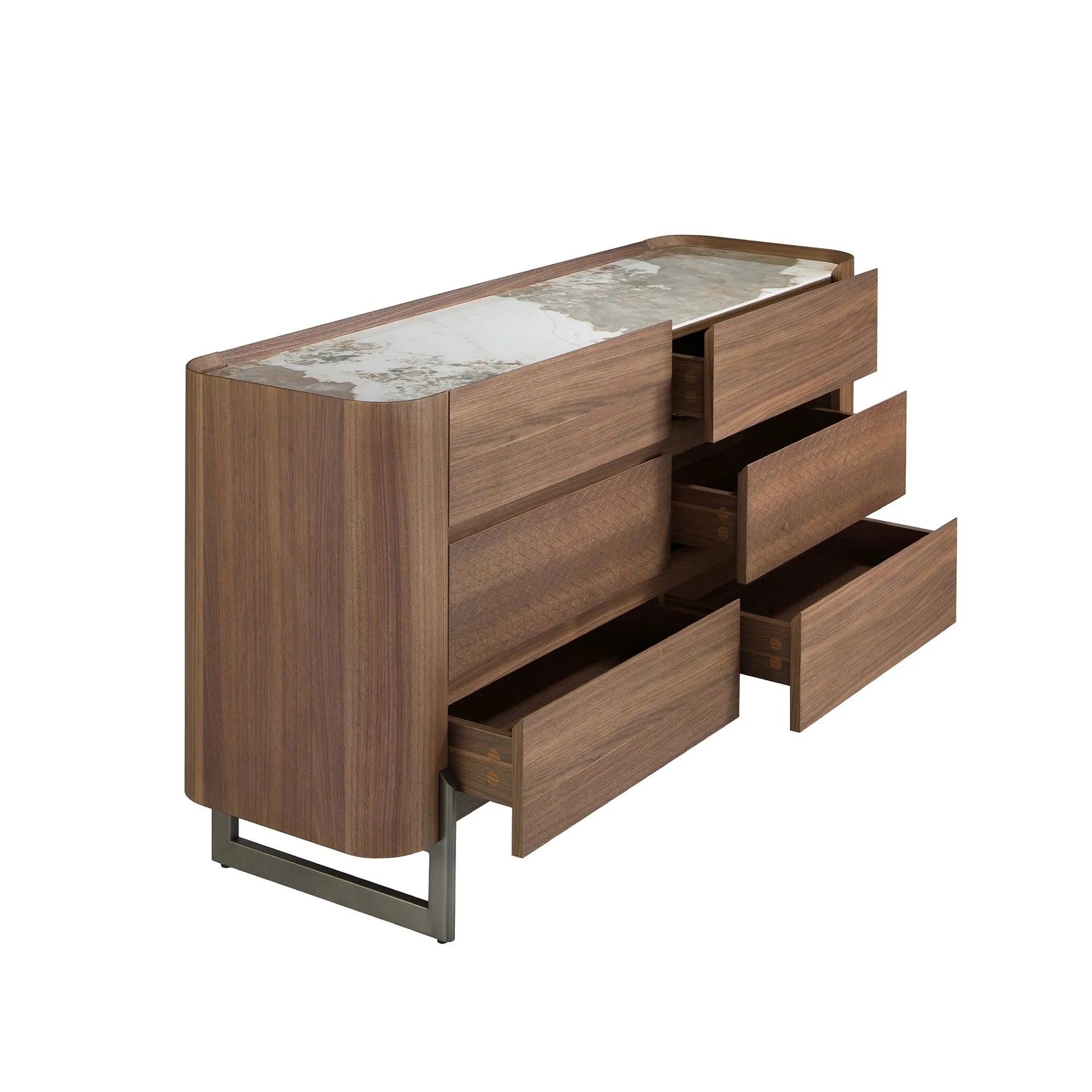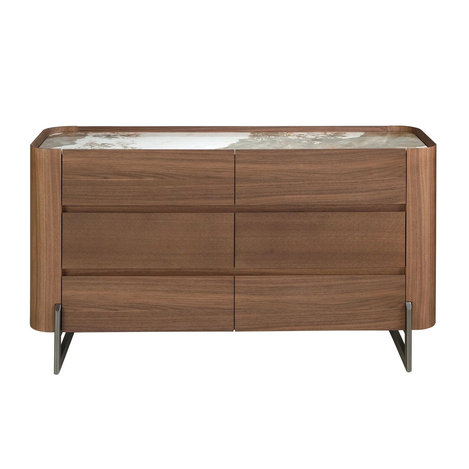 Cómoda nogal, acero visón metal y tapa de mármol porcelánico