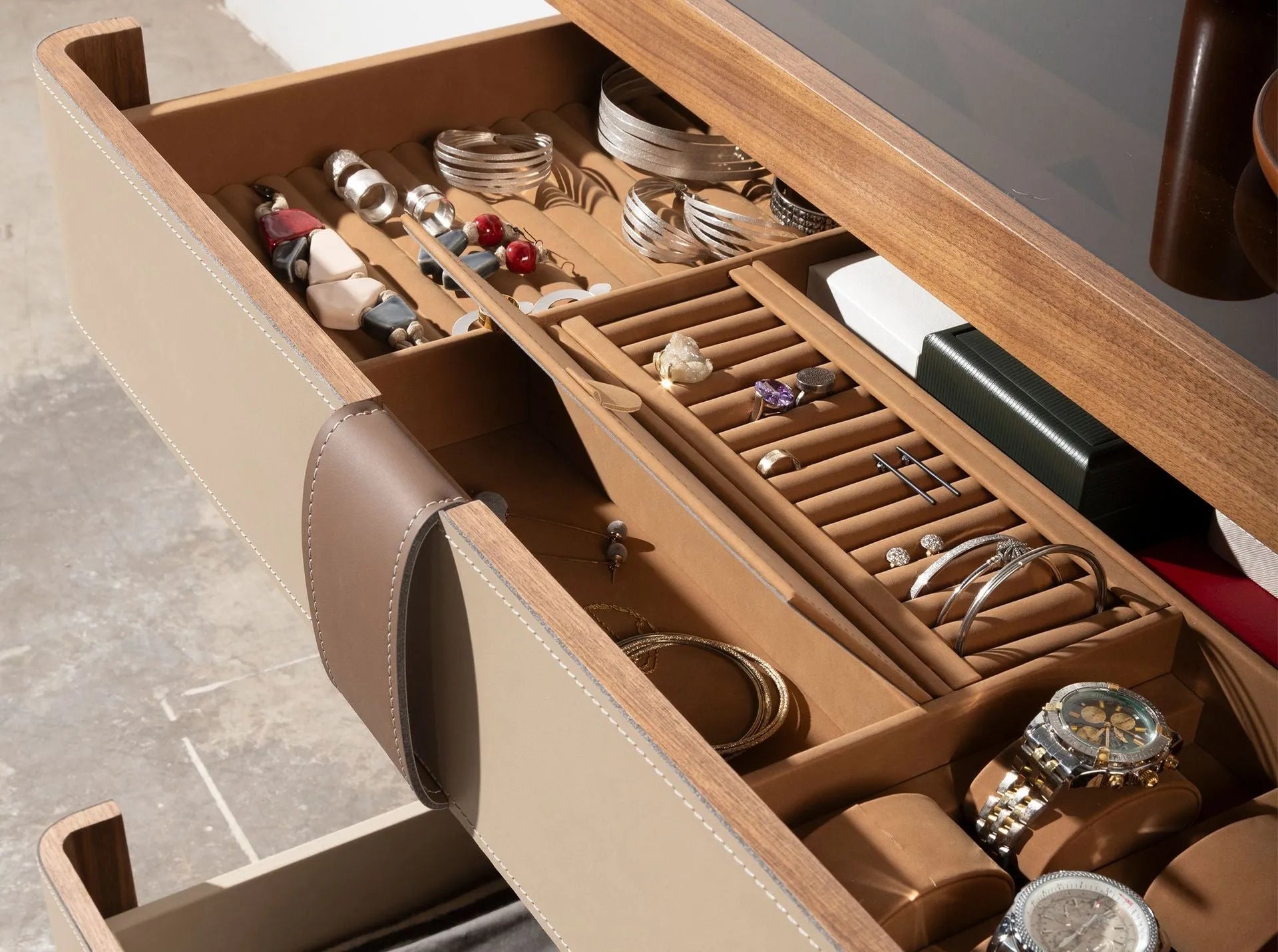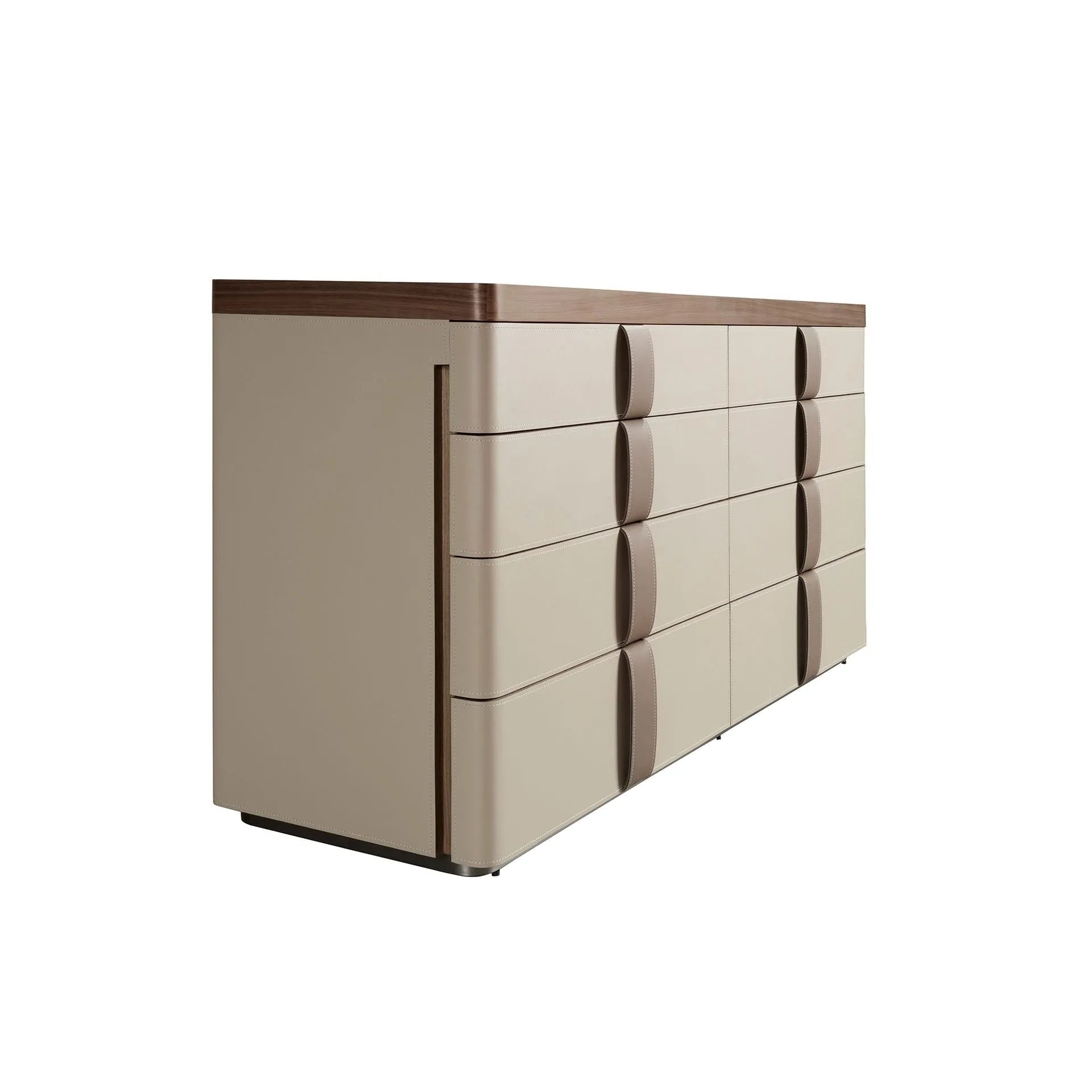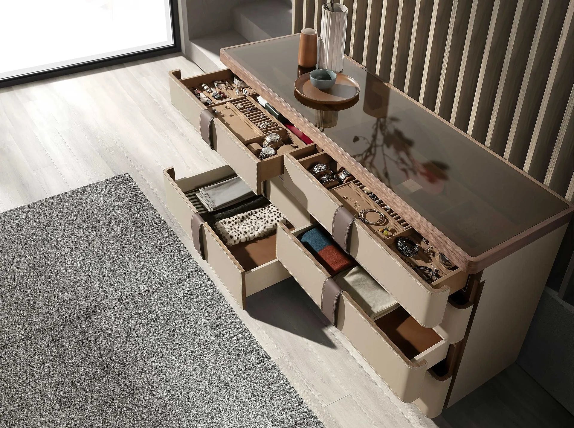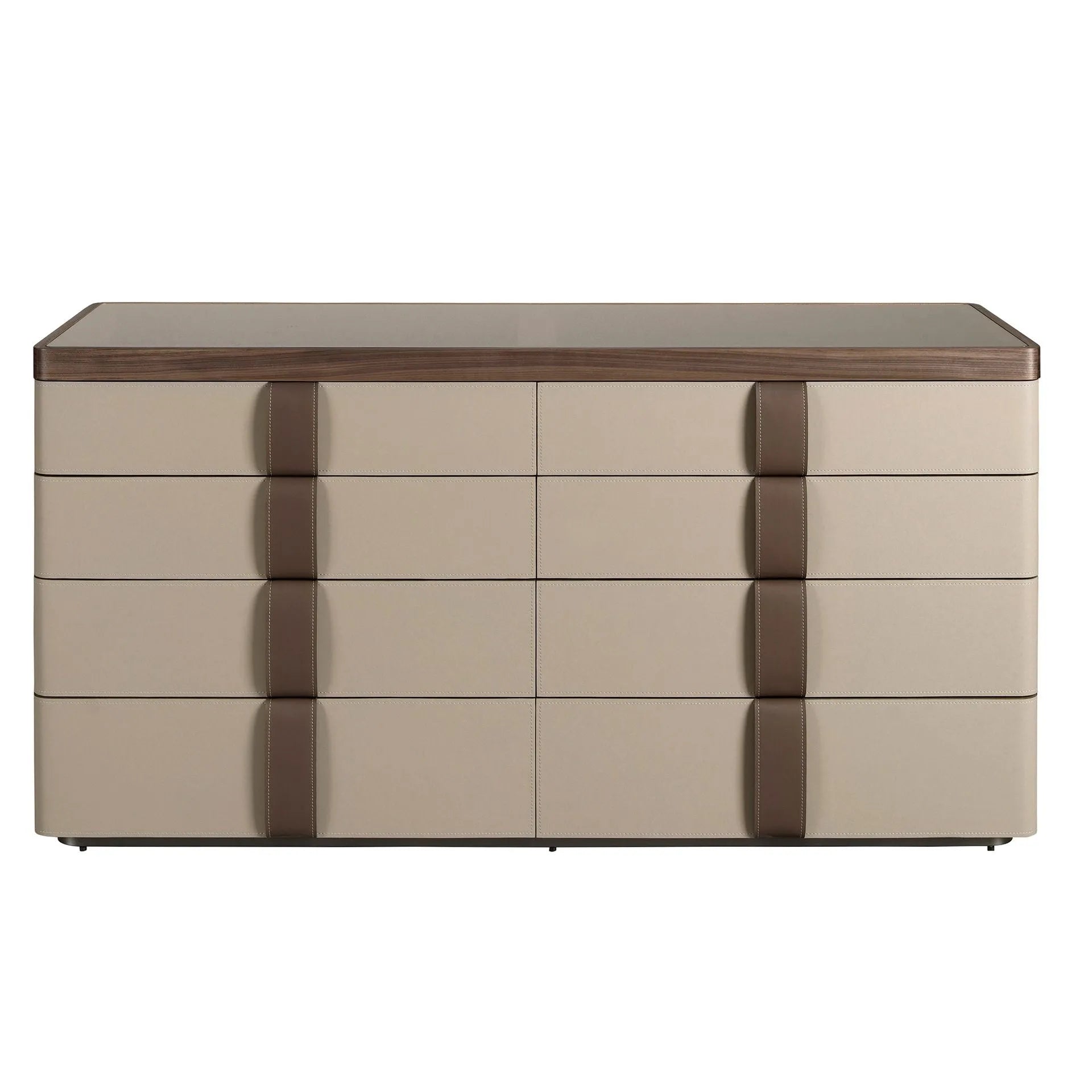 Cómoda piel, nogal, base acero pulido y tapa de cristal fumé marrón