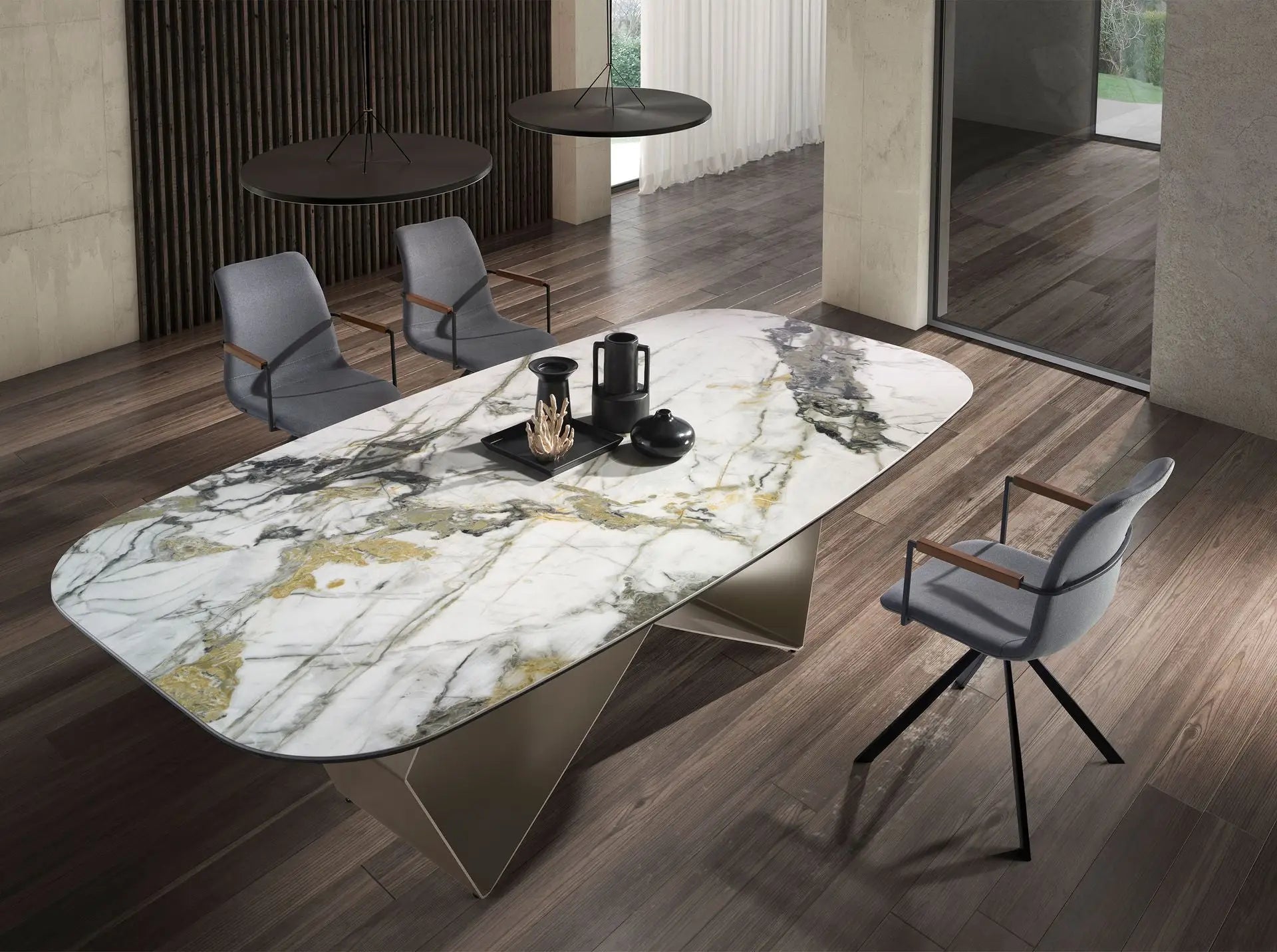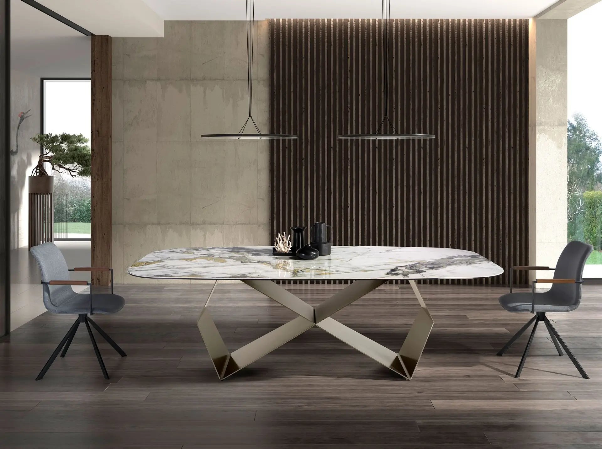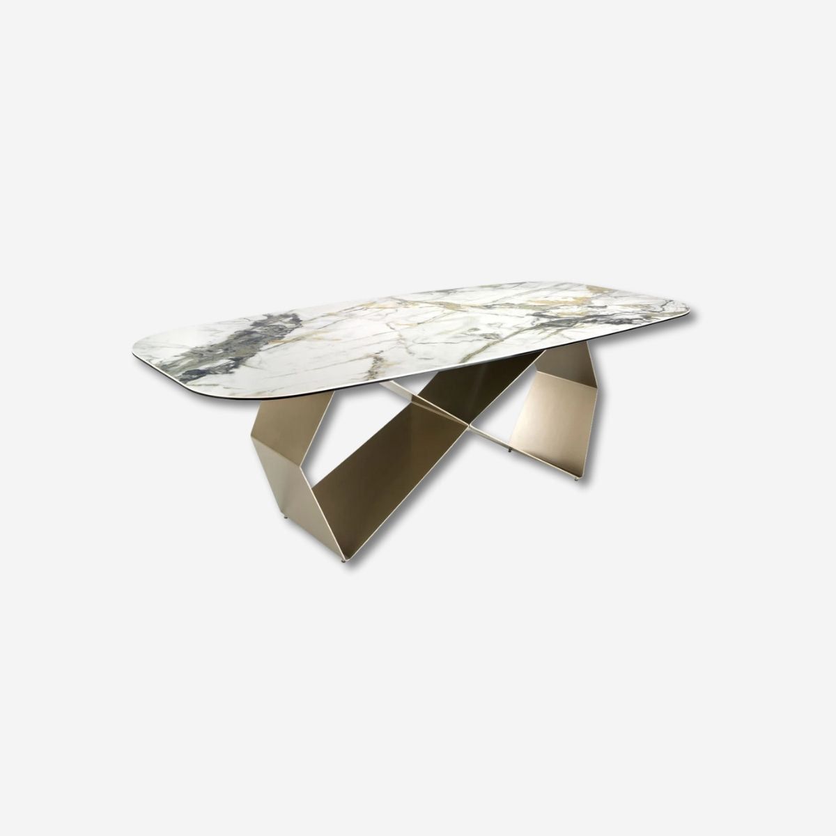 Mesa comedor rectangular mármol porcelánico y acero color champagne
