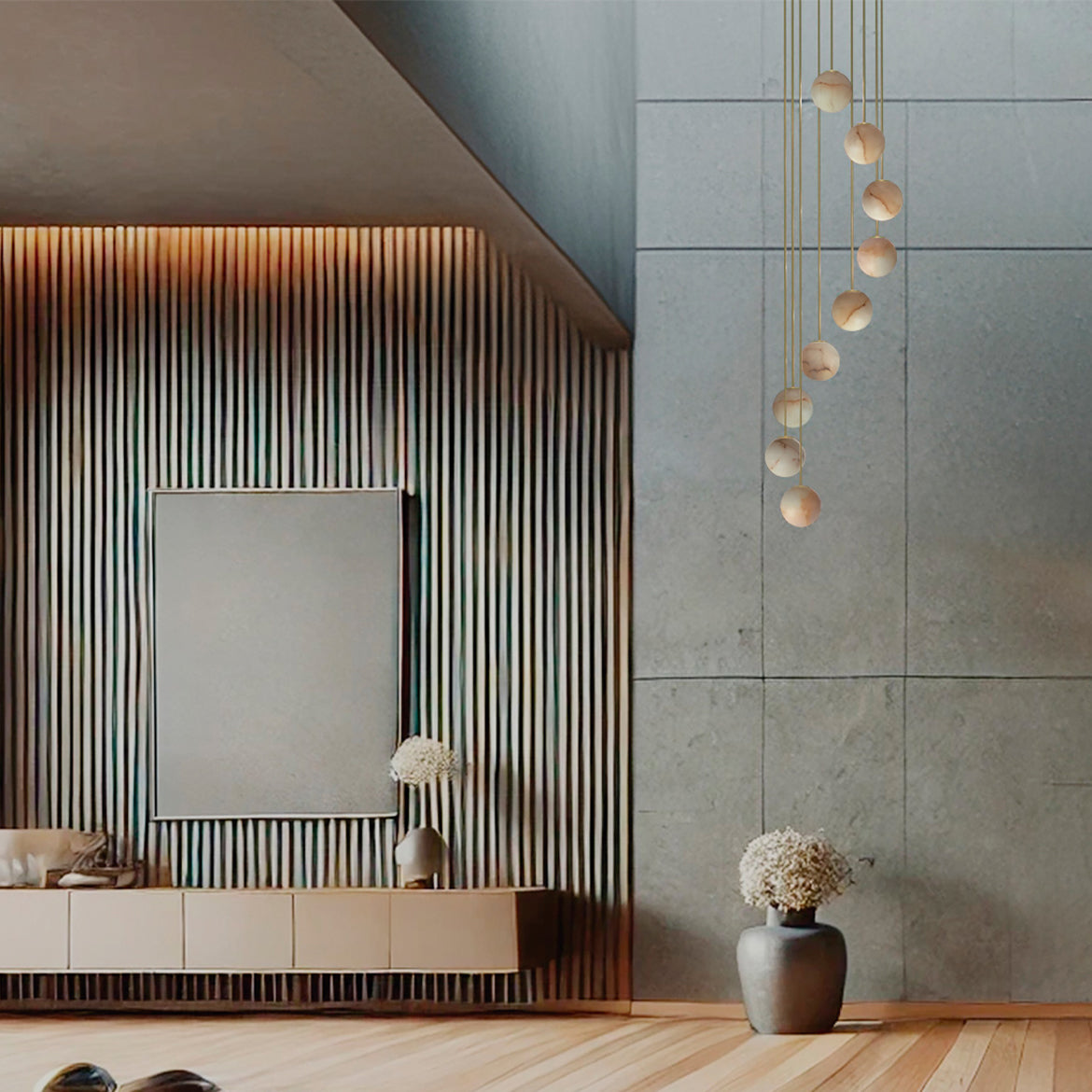 Lámpara Royal Colgante Chandelier Circular Spiral - Estructura dorada, bola de alabastro y cable textil dorado