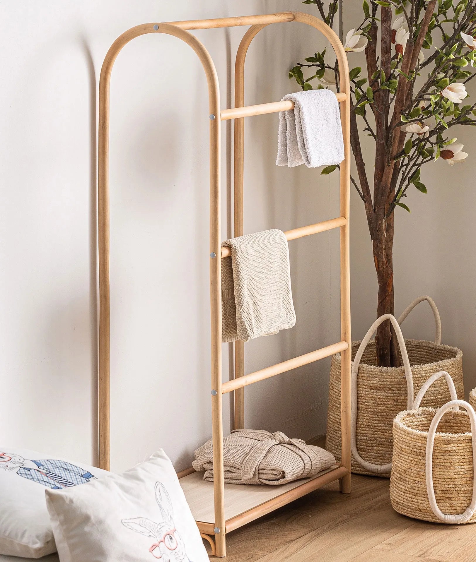 De Cleo handdoekenrek is perfect voor badkamers of slaapkamers, ingericht met lichthouten meubels, natuurlijke vezels en neutrale tinten, en zorgt voor een warme en ontspannen sfeer. Dankzij het veelzijdige ontwerp kan het zowel als handdoekenrek als standaard voor dekens of licht textiel worden gebruikt.