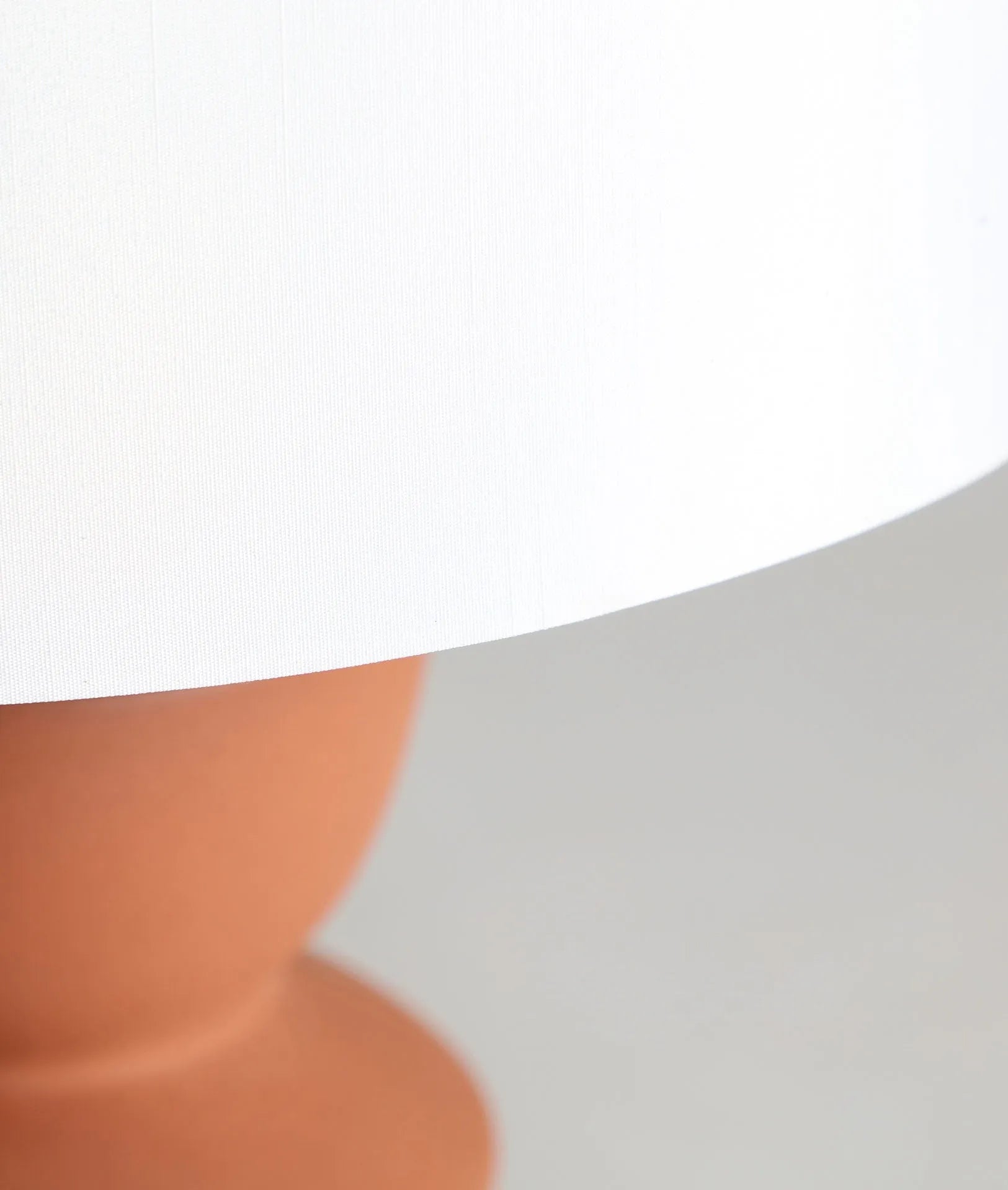 Gemaakt van keramiek en voorzien van ijzeren details en een stoffen lampenkap.