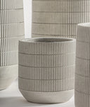 De KODU set van 4 grijze keramische plantenbakken met horizontale lijnen onderscheidt zich door de horizontale lijnen en evenwichtige verhoudingen en biedt een eigentijds meubelstuk dat esthetiek en functionaliteit combineert. De natuurlijke afwerking maakt het een ideale oplossing voor project- en interieurprojecten die rust en moderniteit nastreven door middel van beplanting.