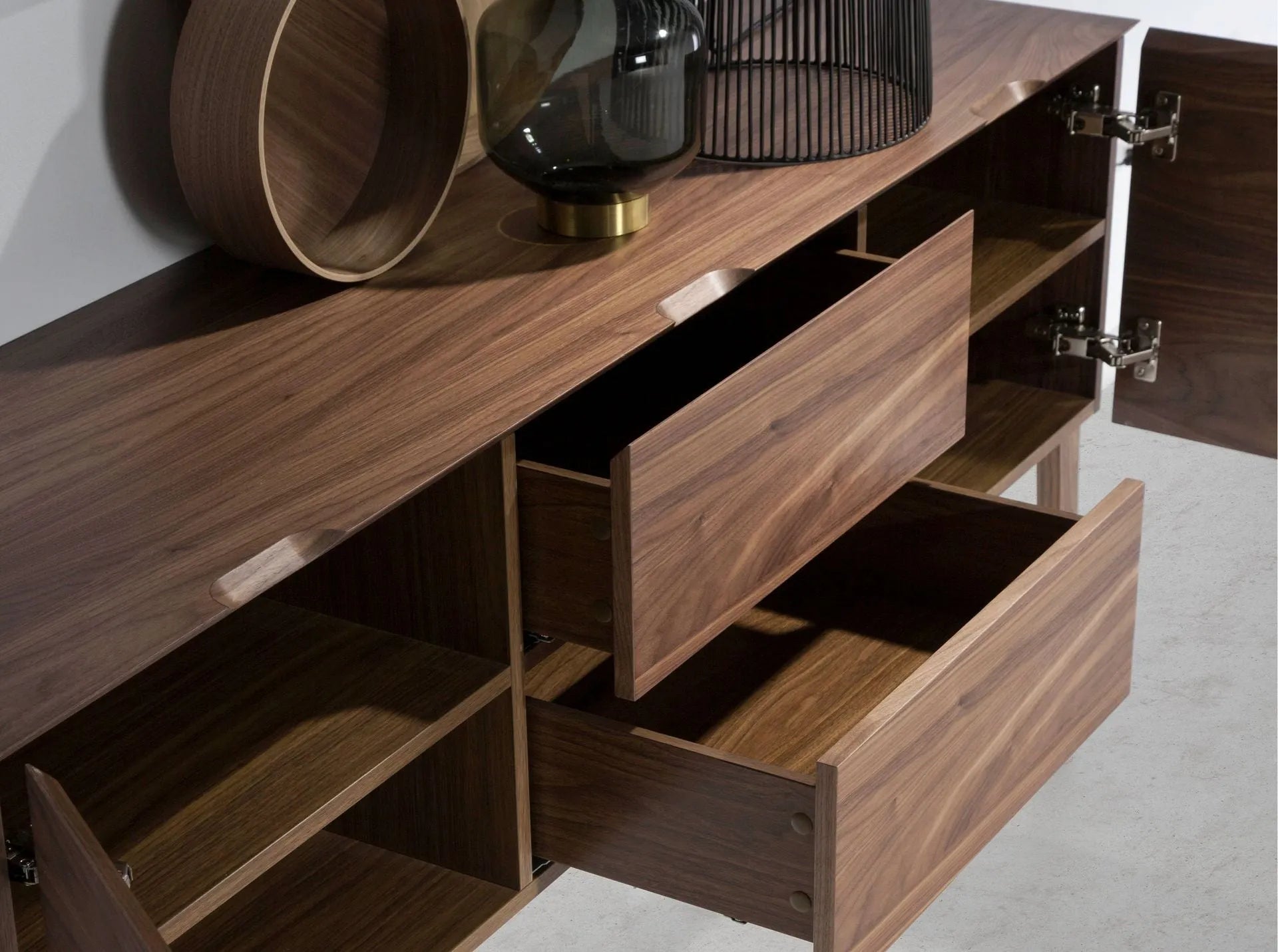 Dressoir met structuur en poten van natuurlijk notenhoutfineer.