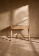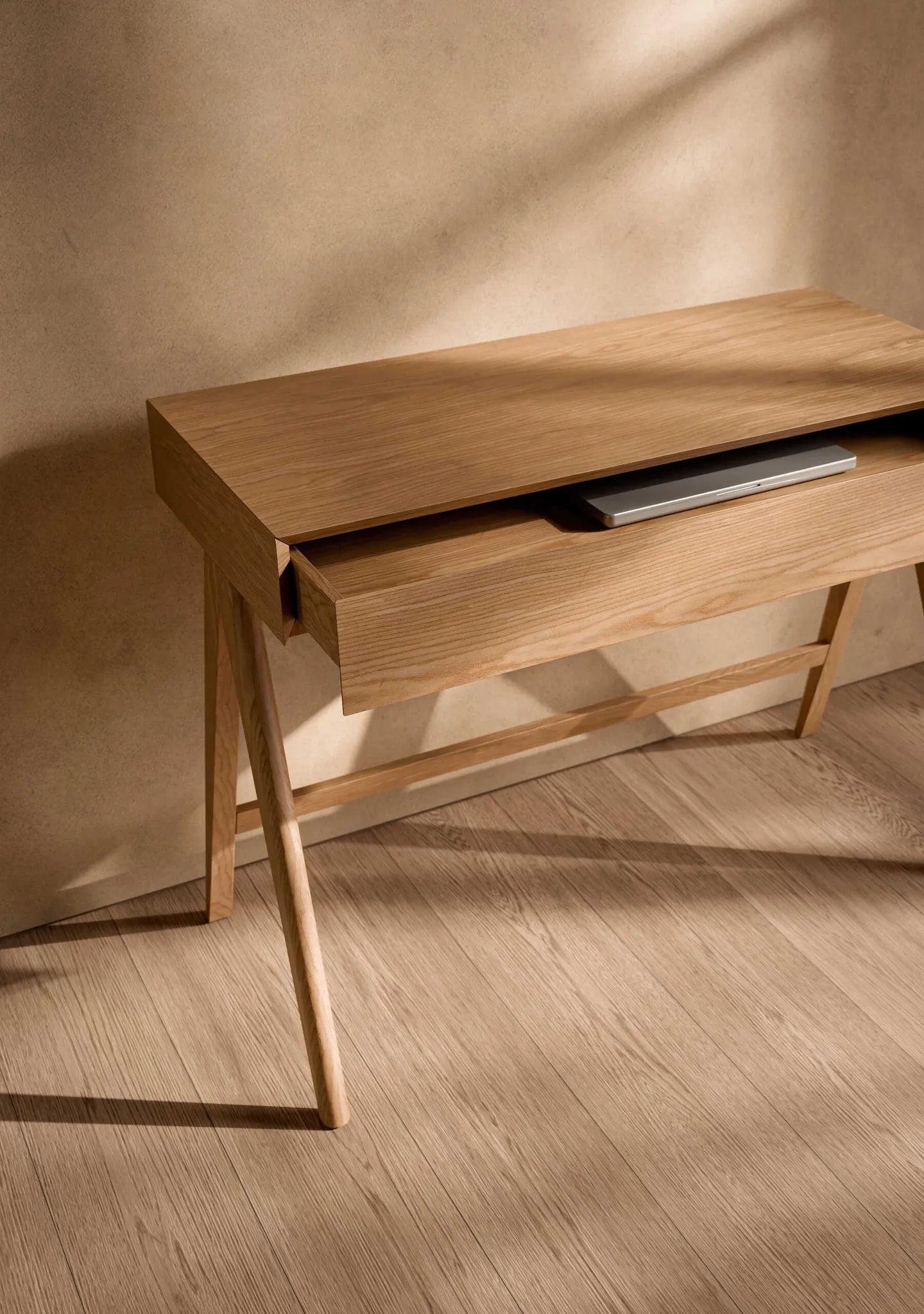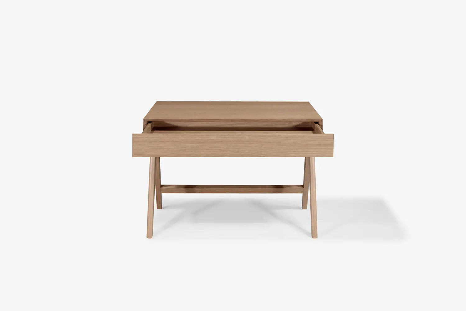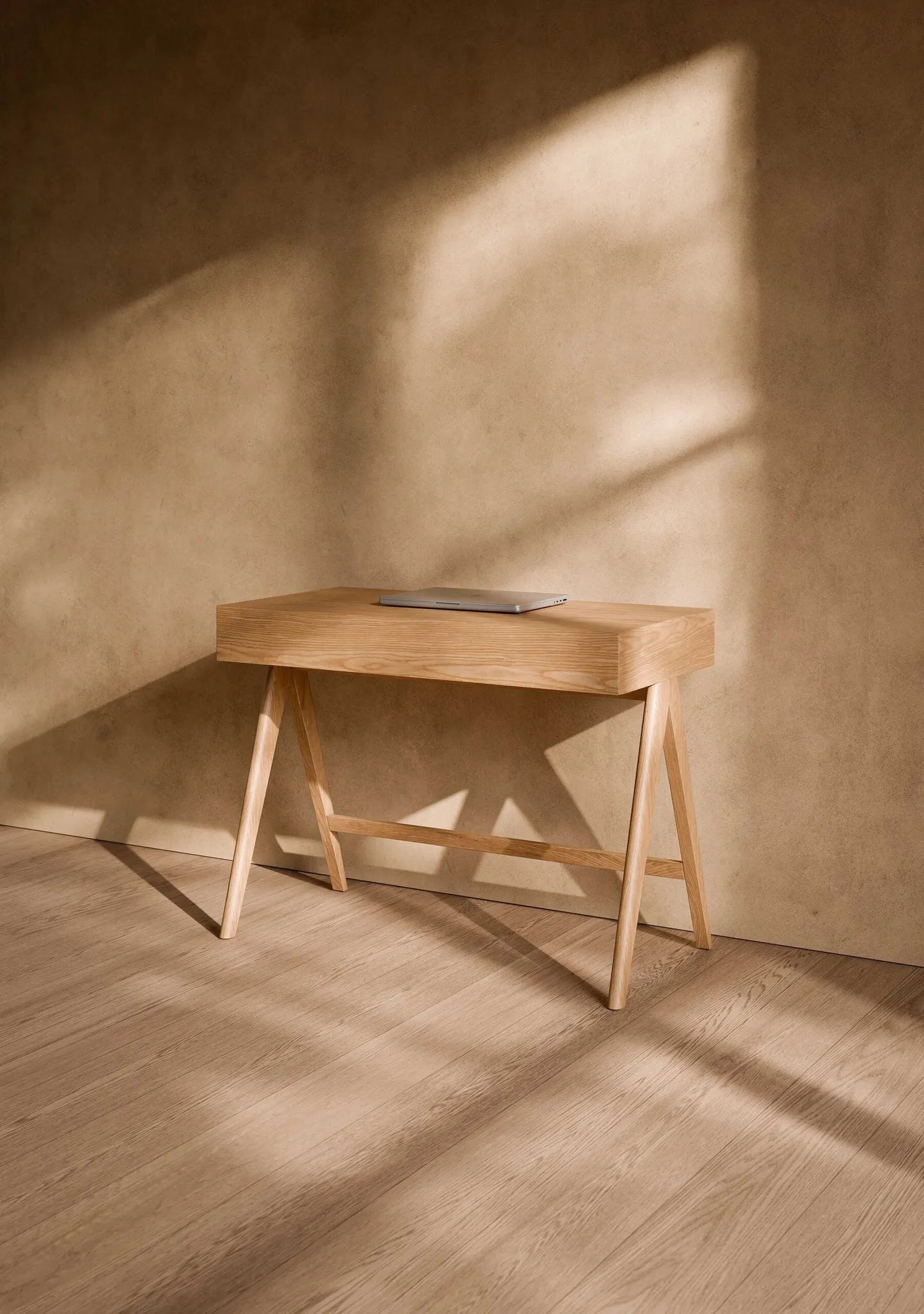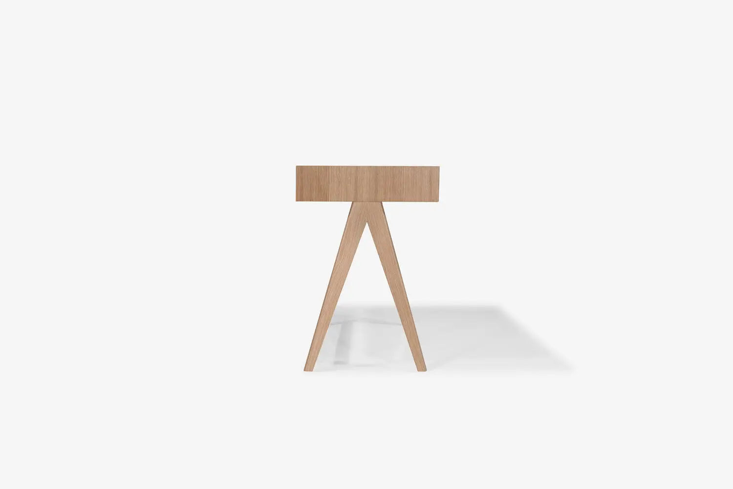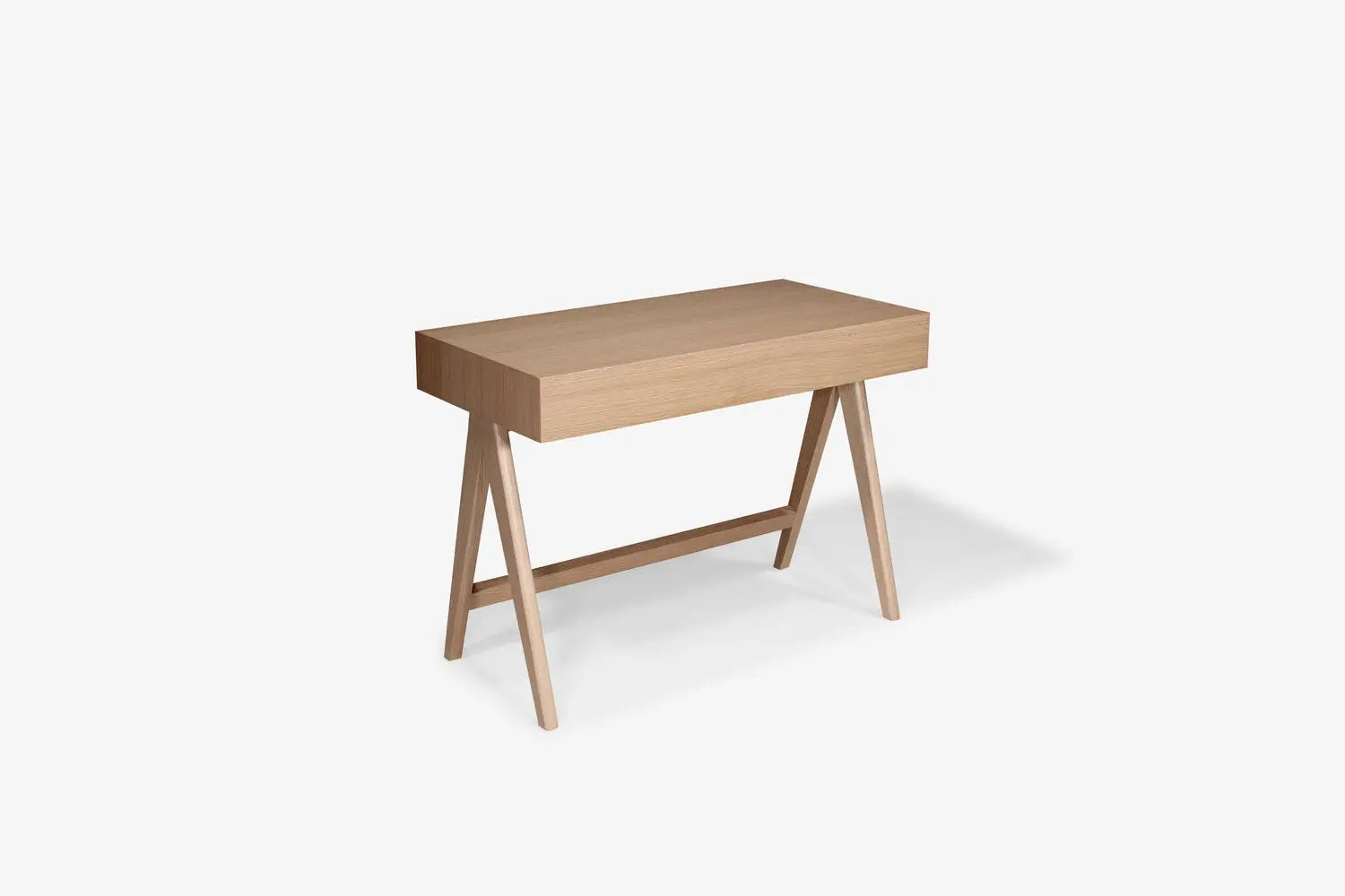 Het Madalena bureau, ontworpen en geproduceerd in Portugal, valt op door zijn eenvoudige, elegante lijnen, ideaal voor thuiswerkplekken. De structuur, bestaande uit vier A-vormige poten, ondersteunt een bovenblad dat discreet een lade verbergt, perfect geïntegreerd in het ontwerp. Ontworpen door Vasco Lima Mayer.