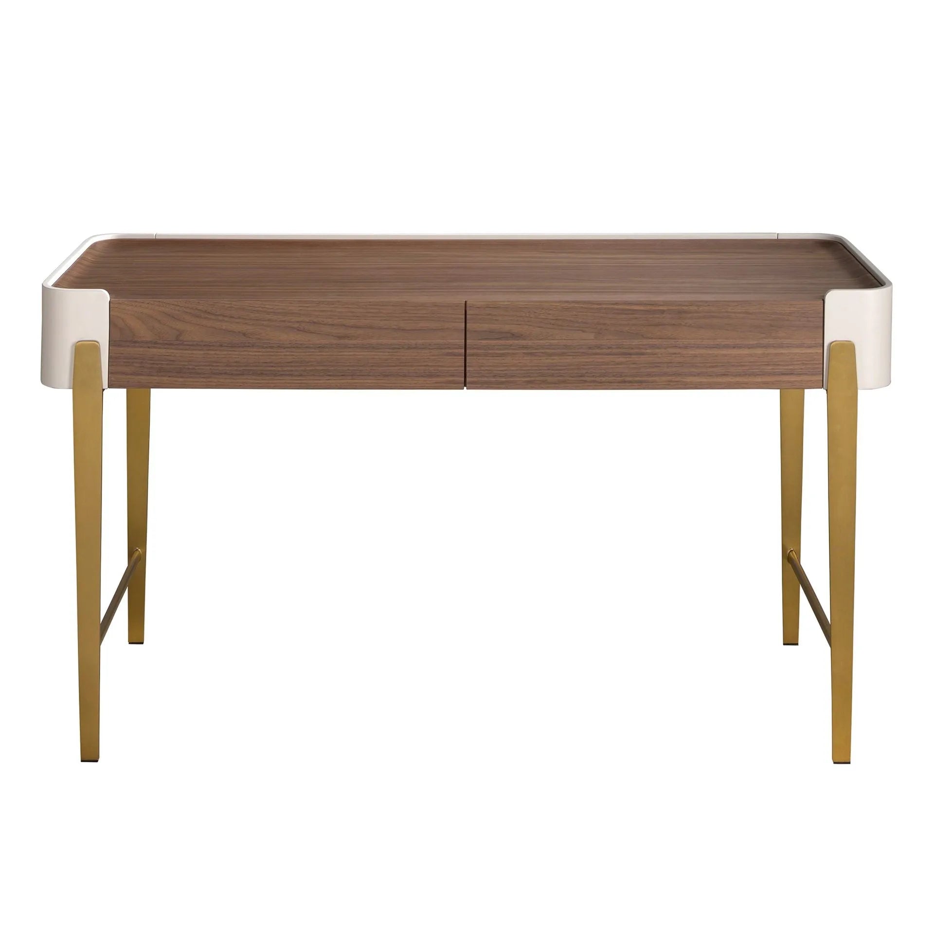 Bureau van notenhout, beige en gepolijst goudkleurig staal