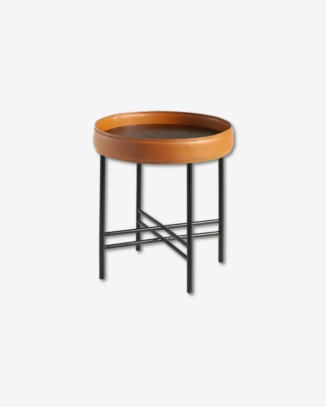 Ronde hoektafel in kunstleer, notenhout en zwart staal