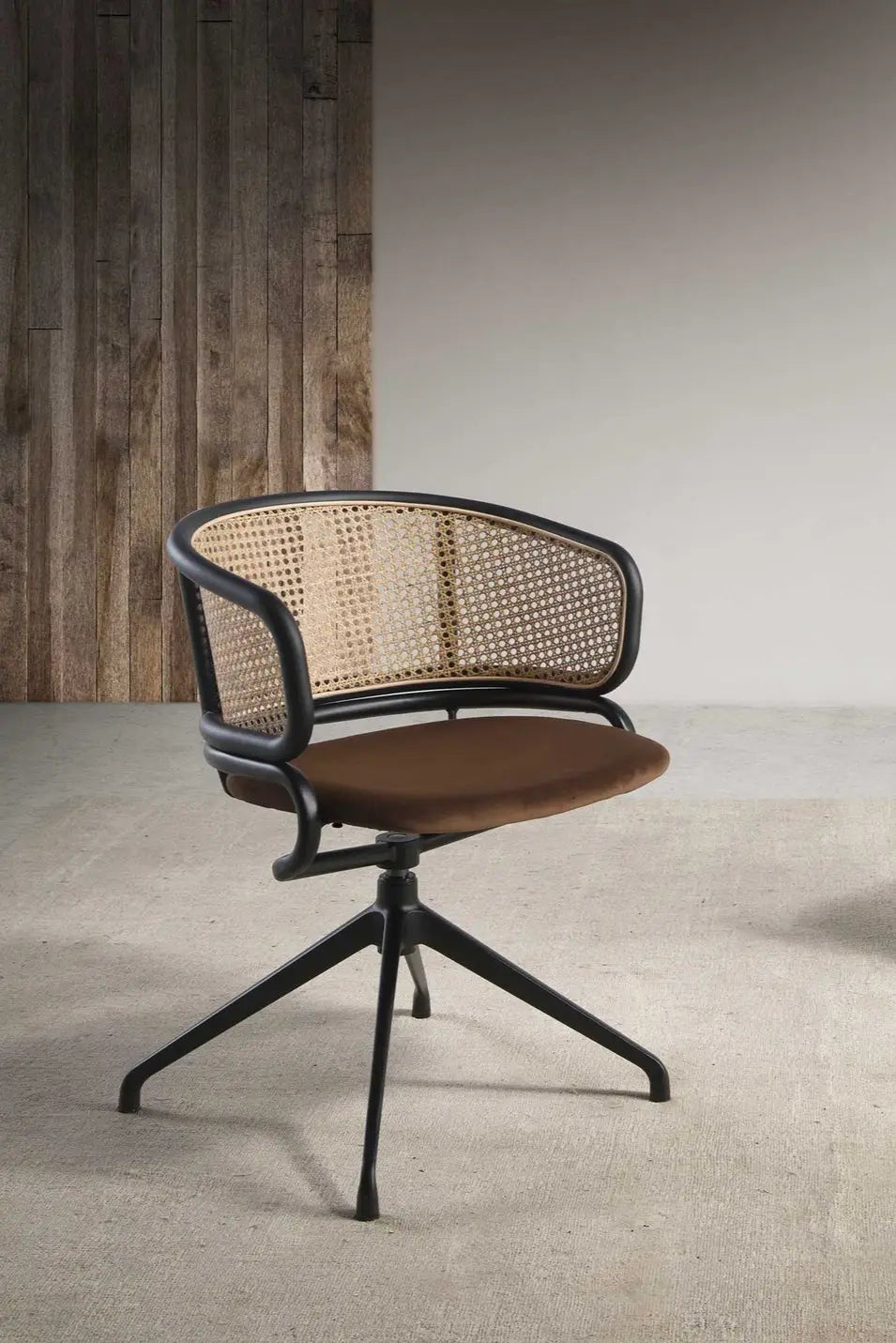 Draaistoel van bruin rotan en fluweel