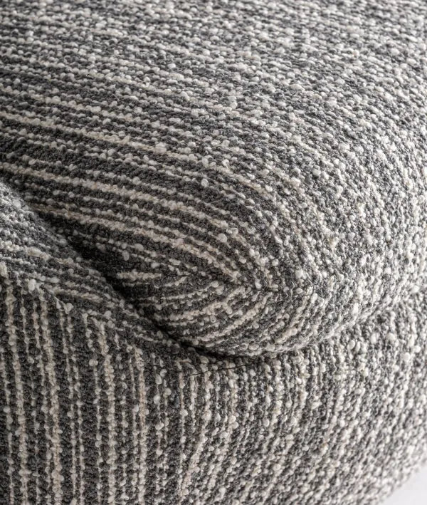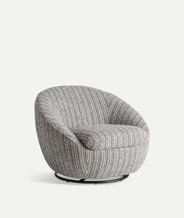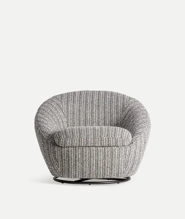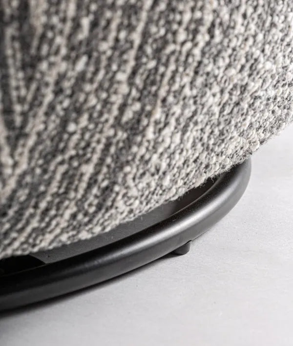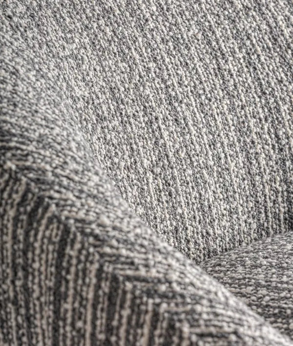 Tapizado en poliéster de alta calidad en un elegante tono gris con acabado jaspeado, aporta textura y modernidad a cualquier ambiente. Su estructura giratoria de 360° ofrece una gran versatilidad y practicidad en el uso diario.