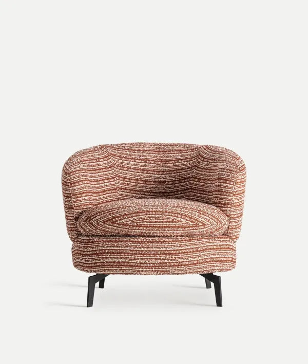 Tapizado en poliéster de alta calidad en un vibrante color terracota que aporta calidez y carácter. Su forma de concha y sus dimensiones lo hacen ideal para un rincón de lectura, un estudio o como asiento auxiliar de diseño.