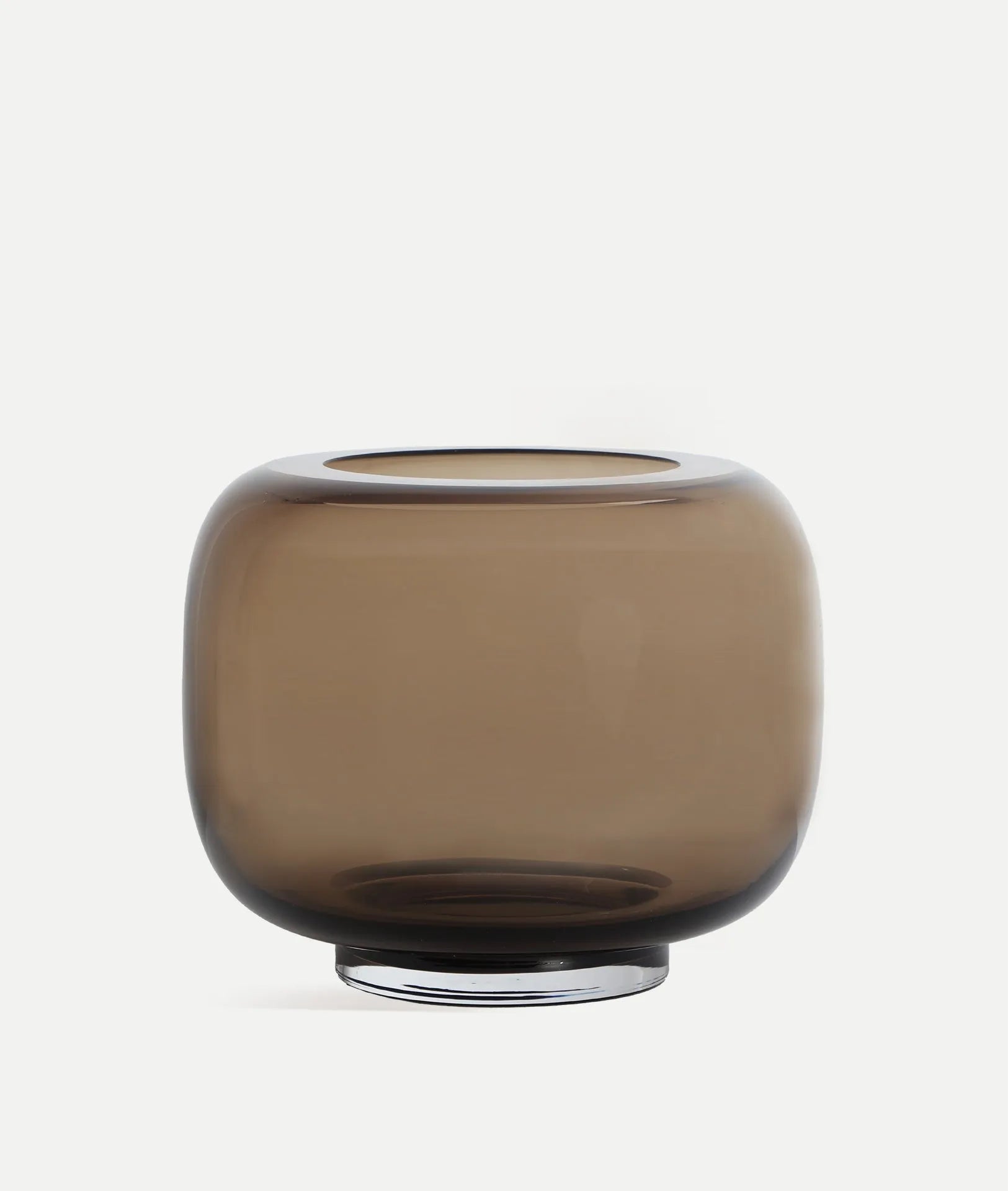 Fabricado en vidrio de color con acabado traslúcido, su estructura es robusta y fácil de integrar. Es perfecto para mostrar pequeños ramos, hojas decorativas o para destacar como pieza independiente sobre libros o bandejas.