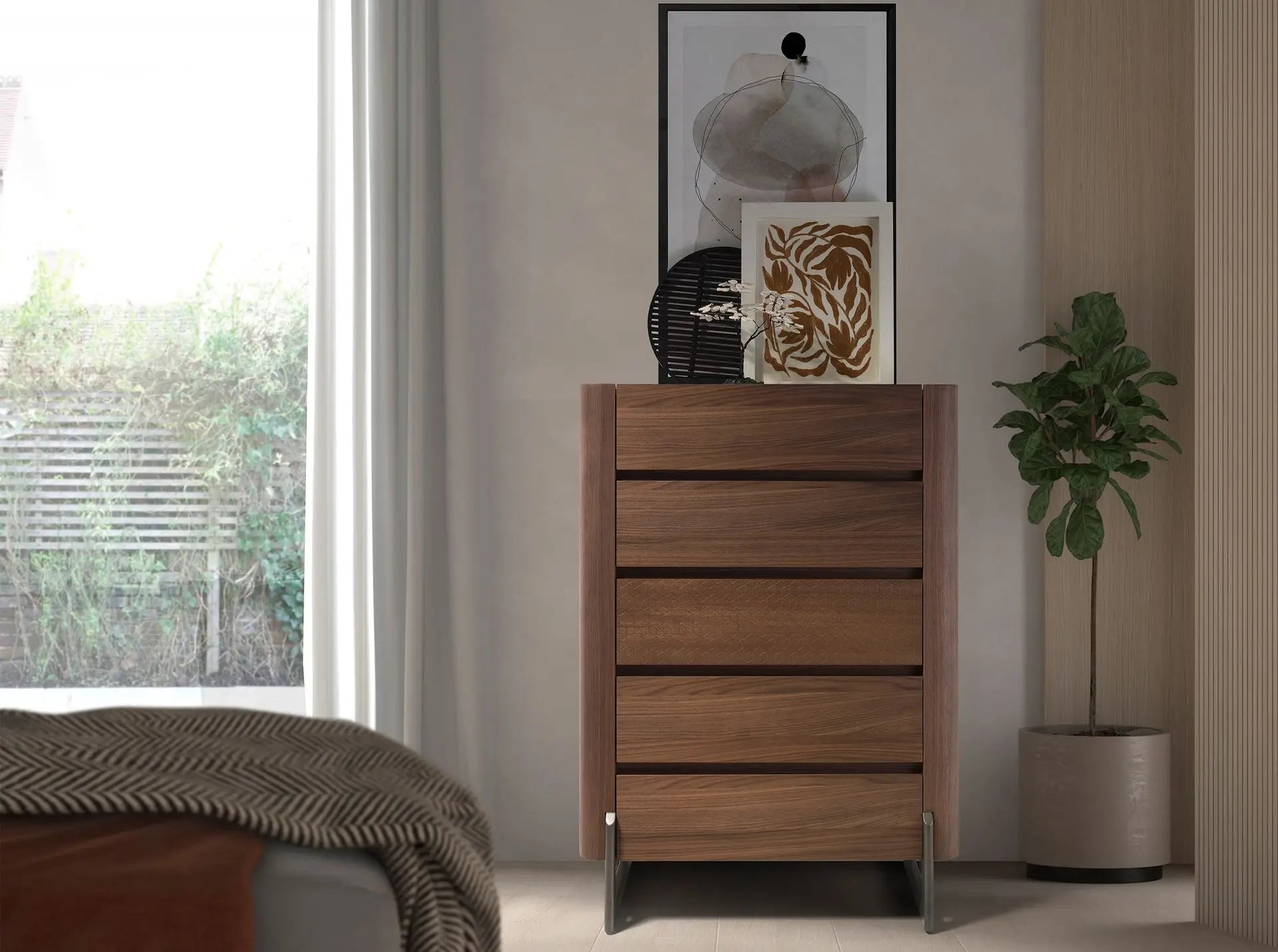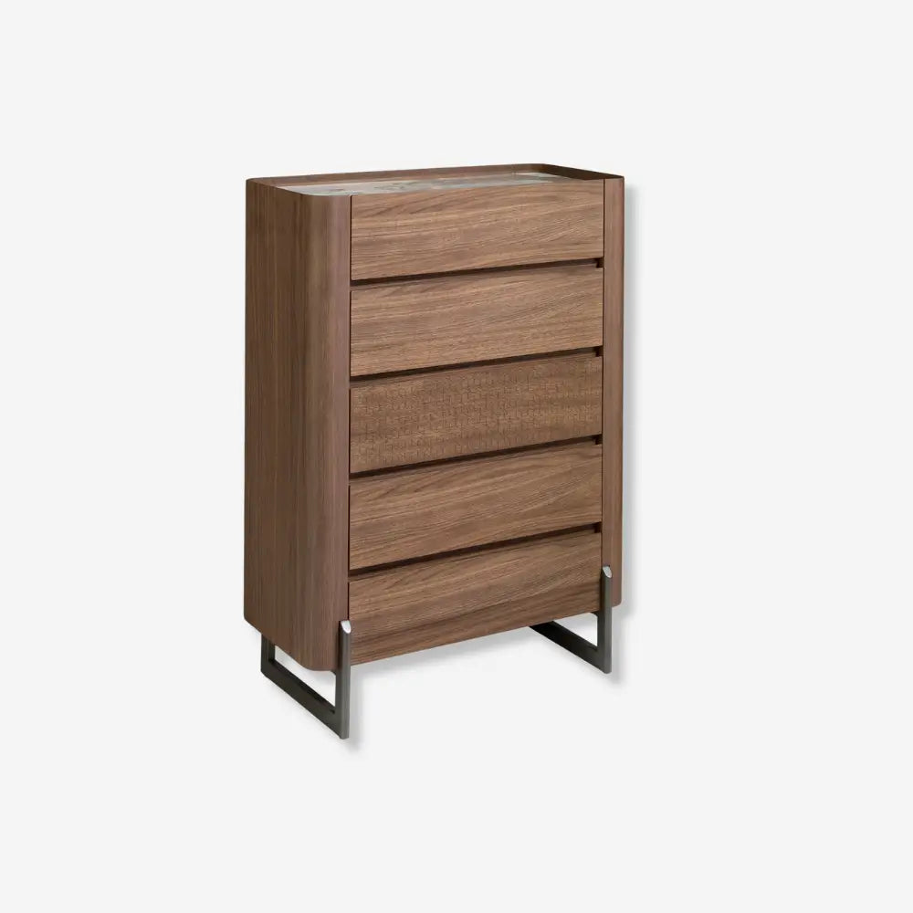 Chifonier de diseño moderno con estructura de madera chapada en nogal natural y unas originales patas de acero inoxidable color visón metal. Gracias a su elegante tapa de mármol porcelánico blanco con vetas en tonalidades grises y marrones en acabado brillo, conseguirá el look sofisticado que busca para sus estancias. Cuenta con un amplio espacio de almacenaje con 5 cajones con sistema de apertura uñero y cierre soft-closing.