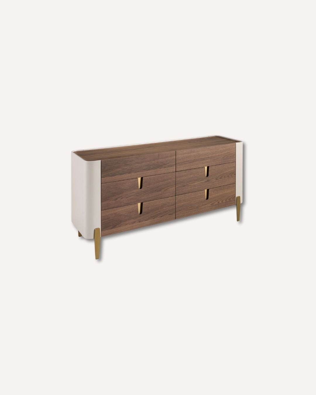 Chest of drawers in walnut, beige, polished gold steel and walnut top