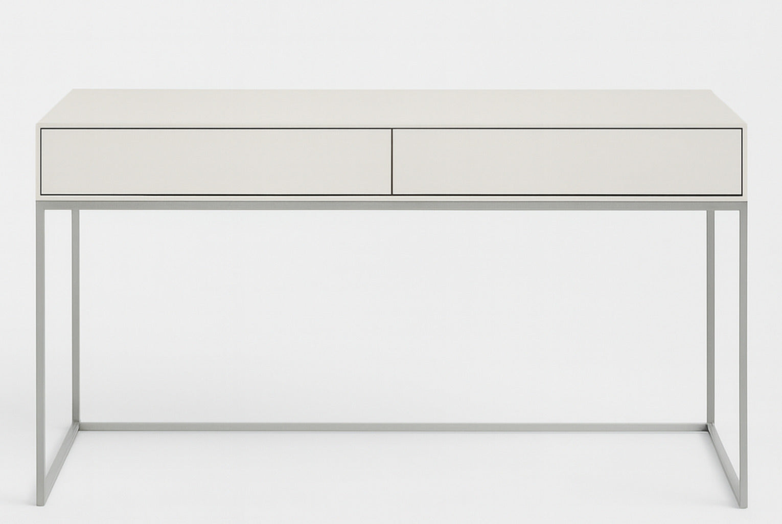 The desks are manufactured with an iron base and the drawer unit can be finished either in lacquered MDF in any color from the sample book or customer's RAL color, or in natural wood veneer of oak, knotty oak, or walnut.