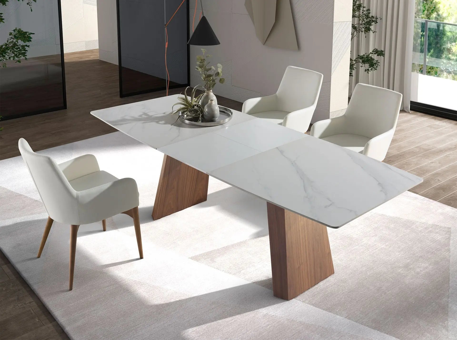 Mesa comedor extensible ovalada barril mármol porcelánico y nogal