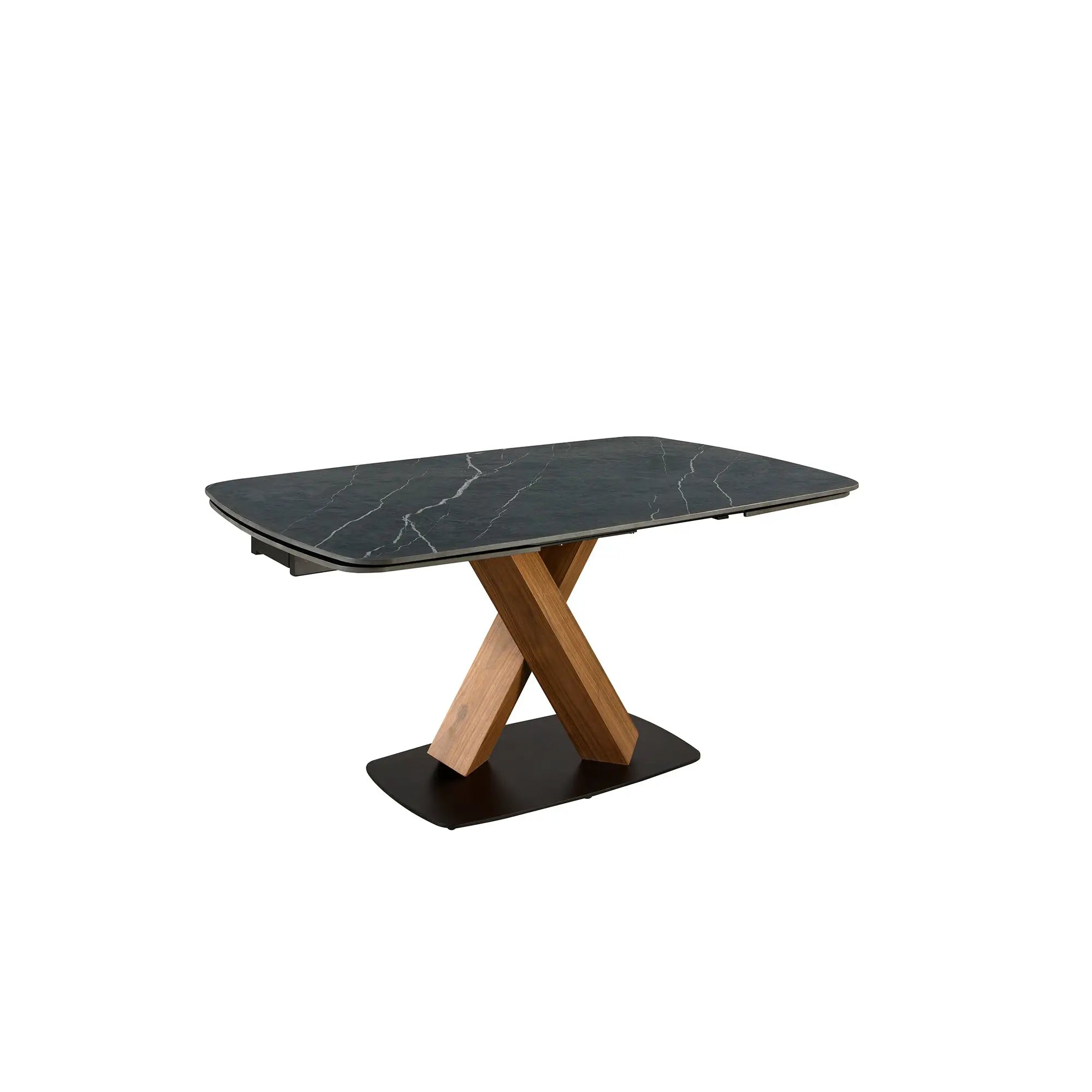 De diseño moderno y exclusivo, presenta una tapa de mármol porcelánico en color negro con vetas blancas efecto piedra y acabado satinado, que aporta sofisticación y resistencia. Sus patas en madera chapada en nogal natural y la base en acero inoxidable pintado en epoxi negro refuerzan su estilo contemporáneo. Gracias a su sistema extensible, se adapta fácilmente a cada ocasión, convirtiéndose en una pieza funcional y versátil para el día a día.