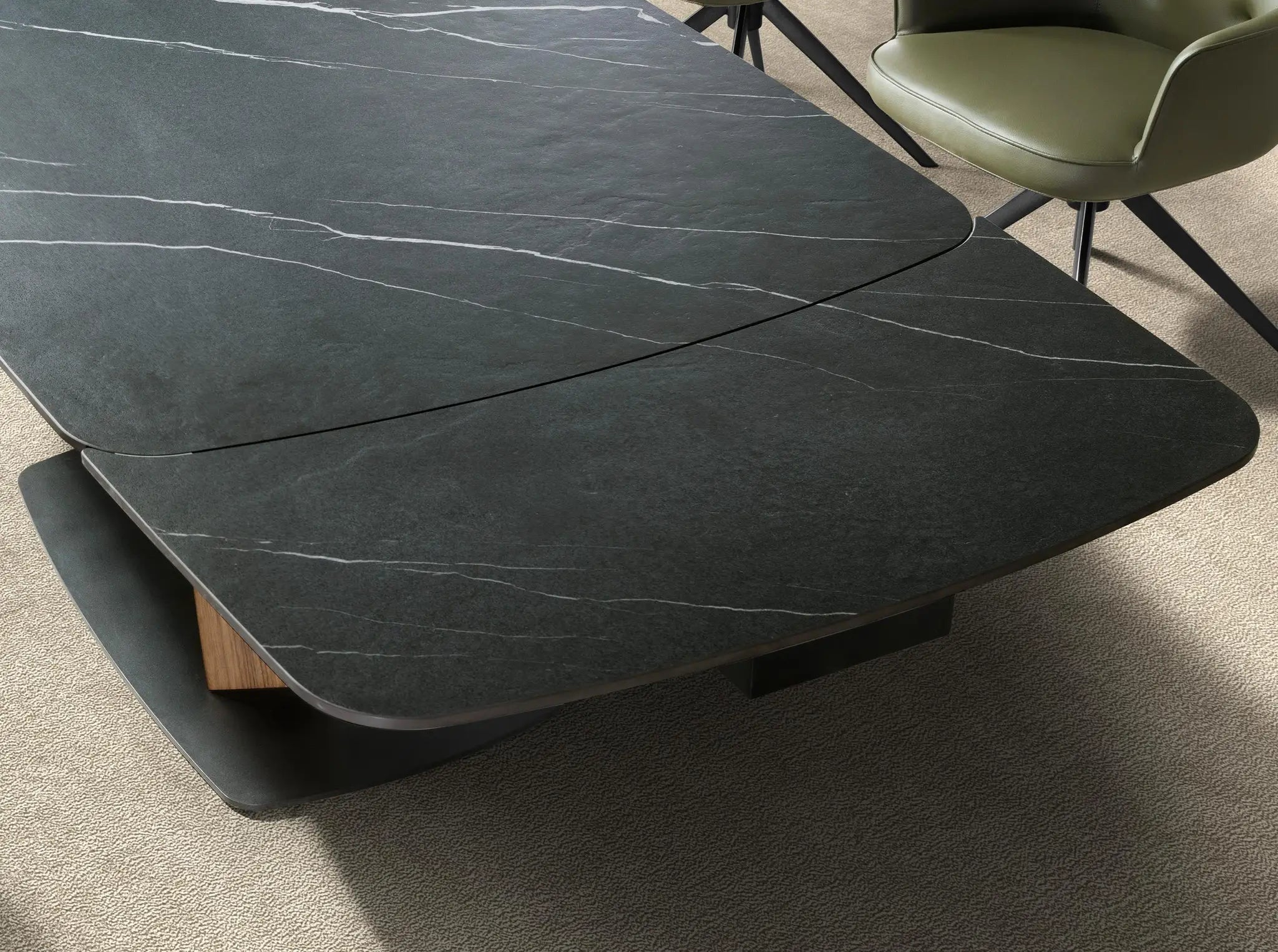 Mesa de comedor extensible ovalada en porcelánico negro y nogal