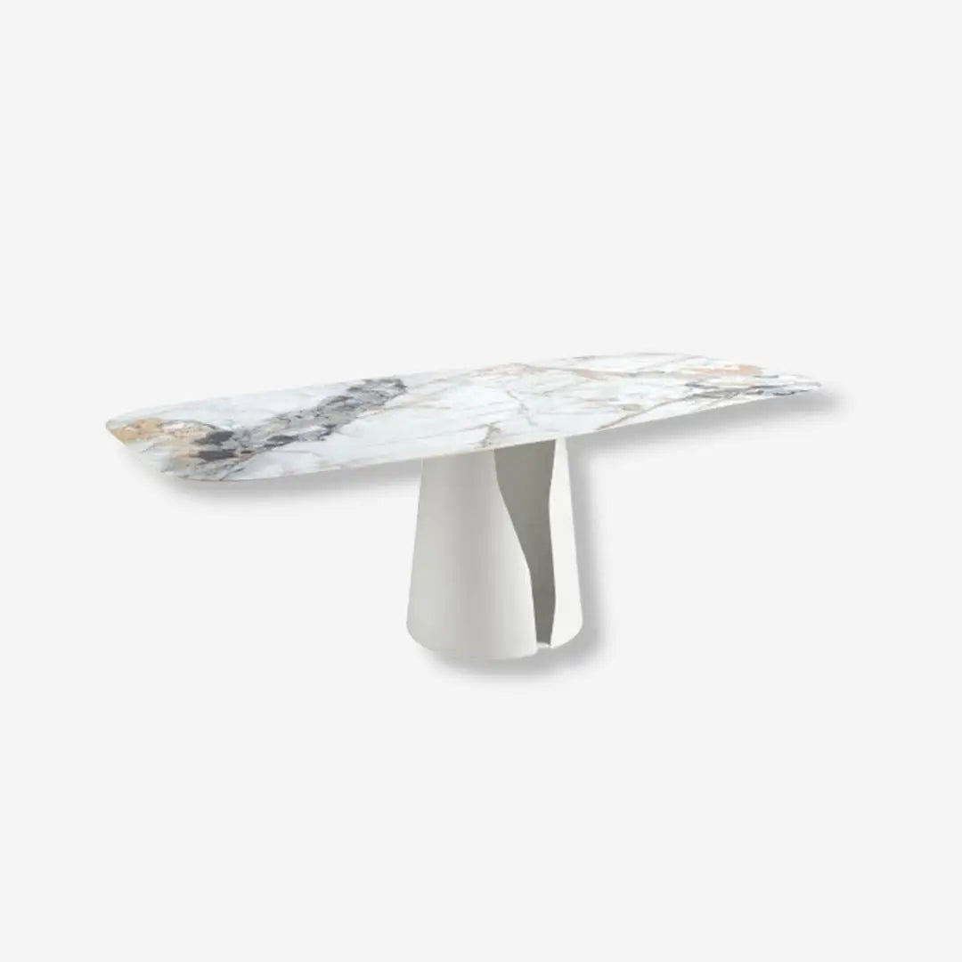 Mesa comedor ovalada barril mármol porcelánico y acero blanco