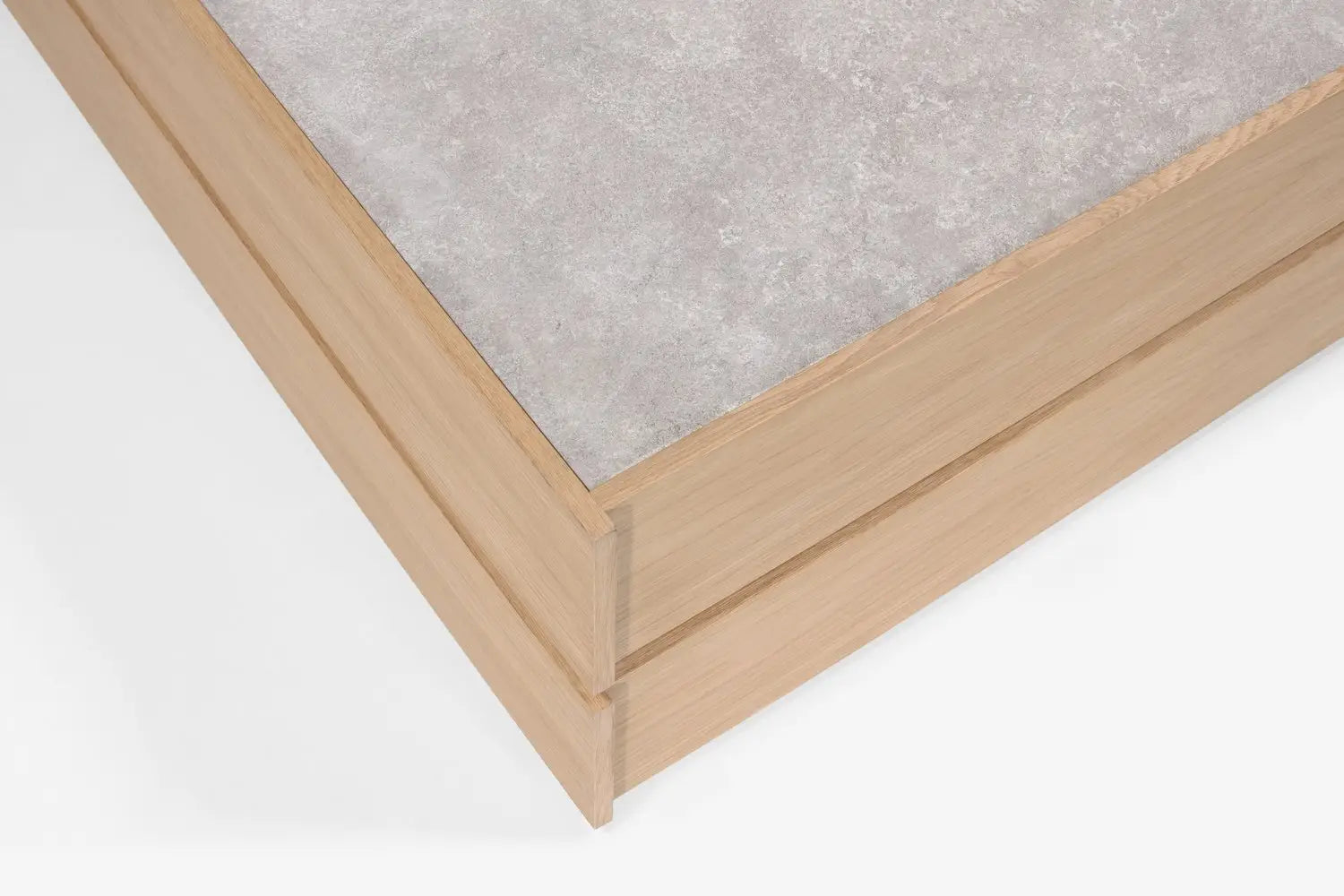 Diseñada y fabricada en Portugal, la mesa de centro Joana es una pieza única que combina elegancia y versatilidad.  Su tablero cerámico está enmarcado por tablones de madera cuidadosamente trabajados, creando un contraste sofisticado que encaja a la perfección en interiores modernos, rústicos o escandinavos. Diseñada por Vasco Lima Mayer.