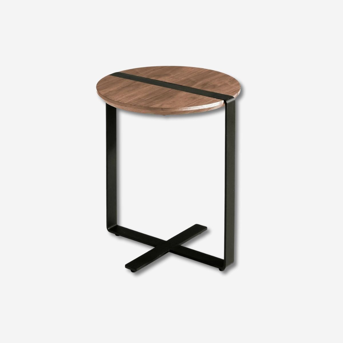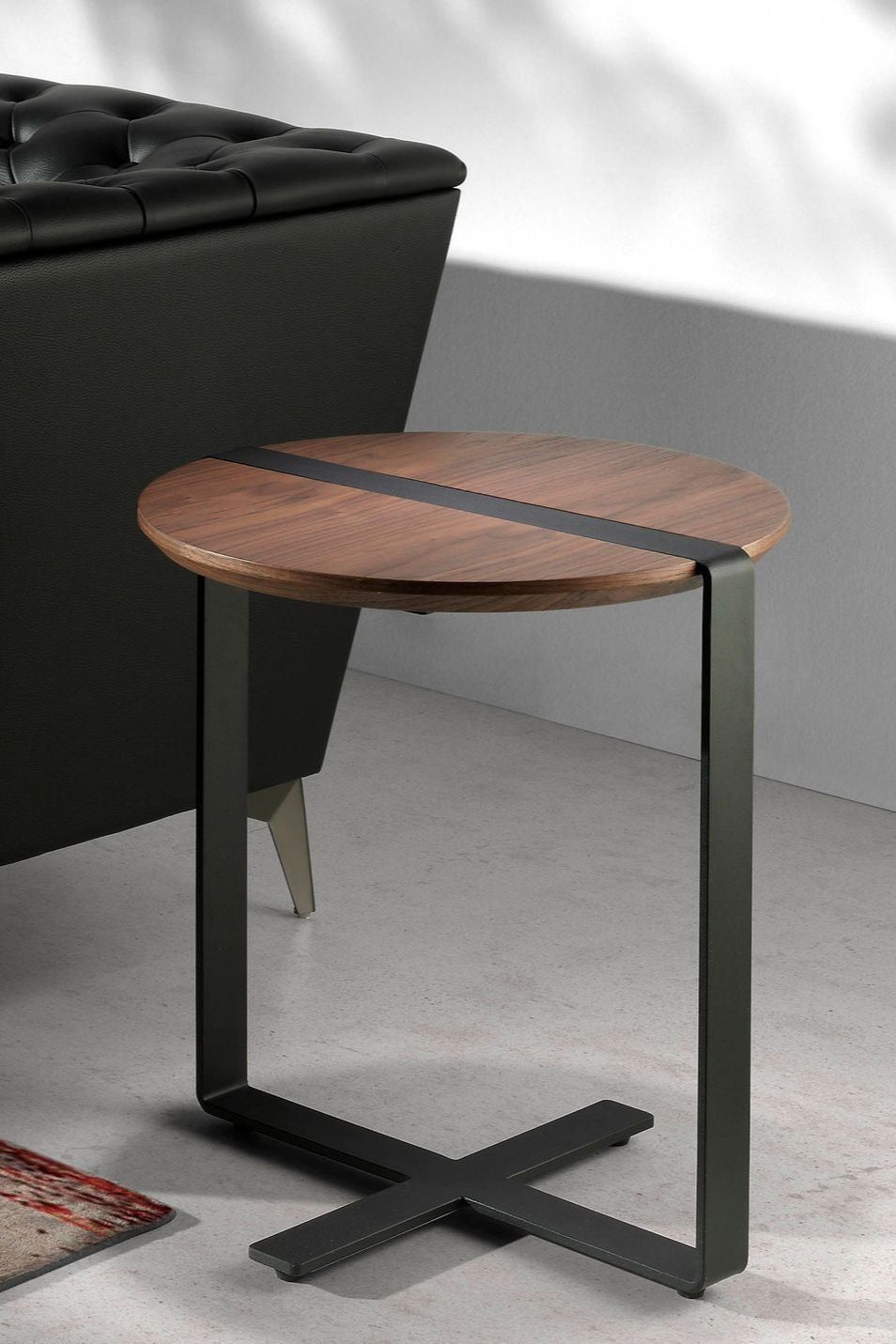 Mesa rincón redonda en nogal y acero negro