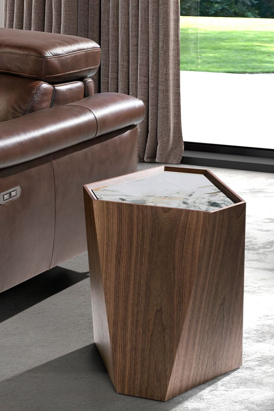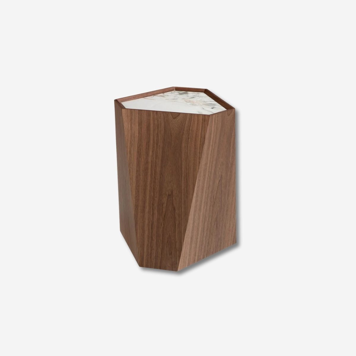 Mesa rincón triangular mármol porcelánico y nogal