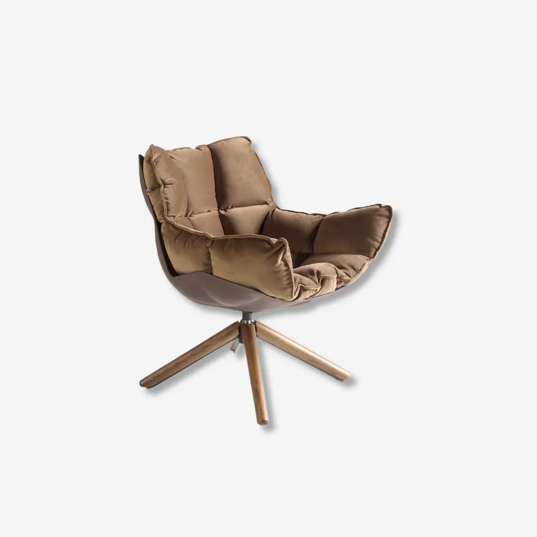 Este sillón giratorio de diseño moderno destaca por su forma envolvente y el confort de sus materiales. La tapicería en tela aterciopelada marrón aporta suavidad y calidez, mientras que las patas de madera en tono nogal refuerzan su estética natural y elegante.