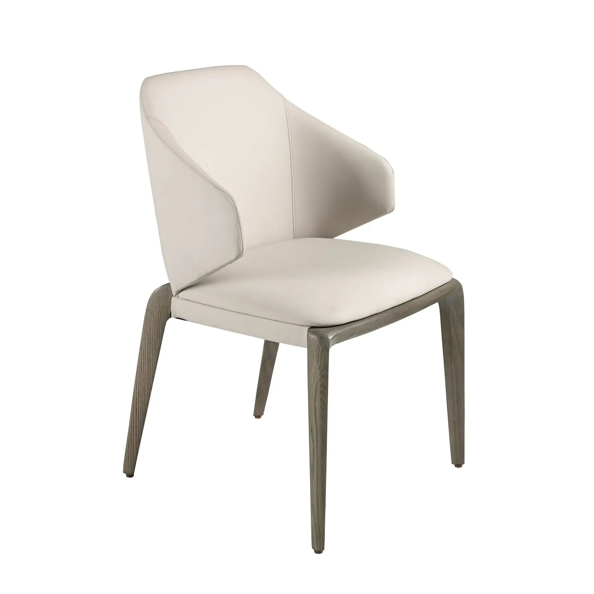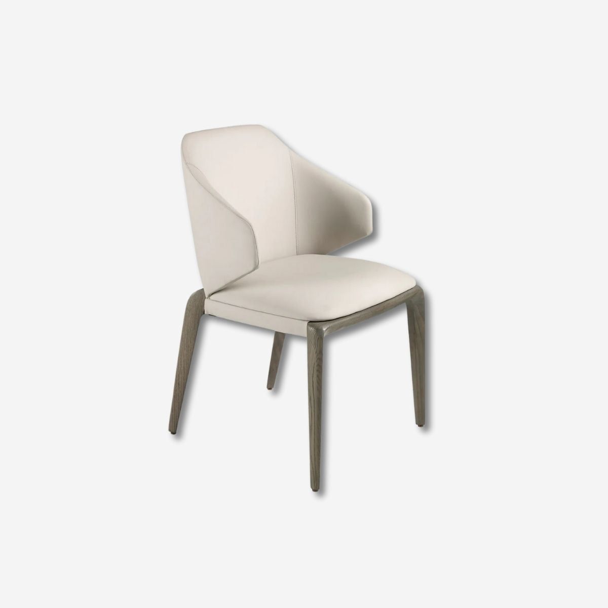 Silla de comedor moderna tapizada en polipiel crema con patas de madera de roble color ceniza. Su diseño elegante y atemporal aporta calidez y estilo, mientras que el asiento acolchado en espuma de alta densidad y el respaldo ergonómico garantizan máximo confort.