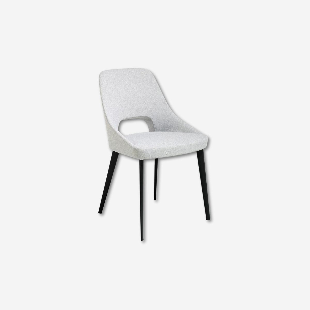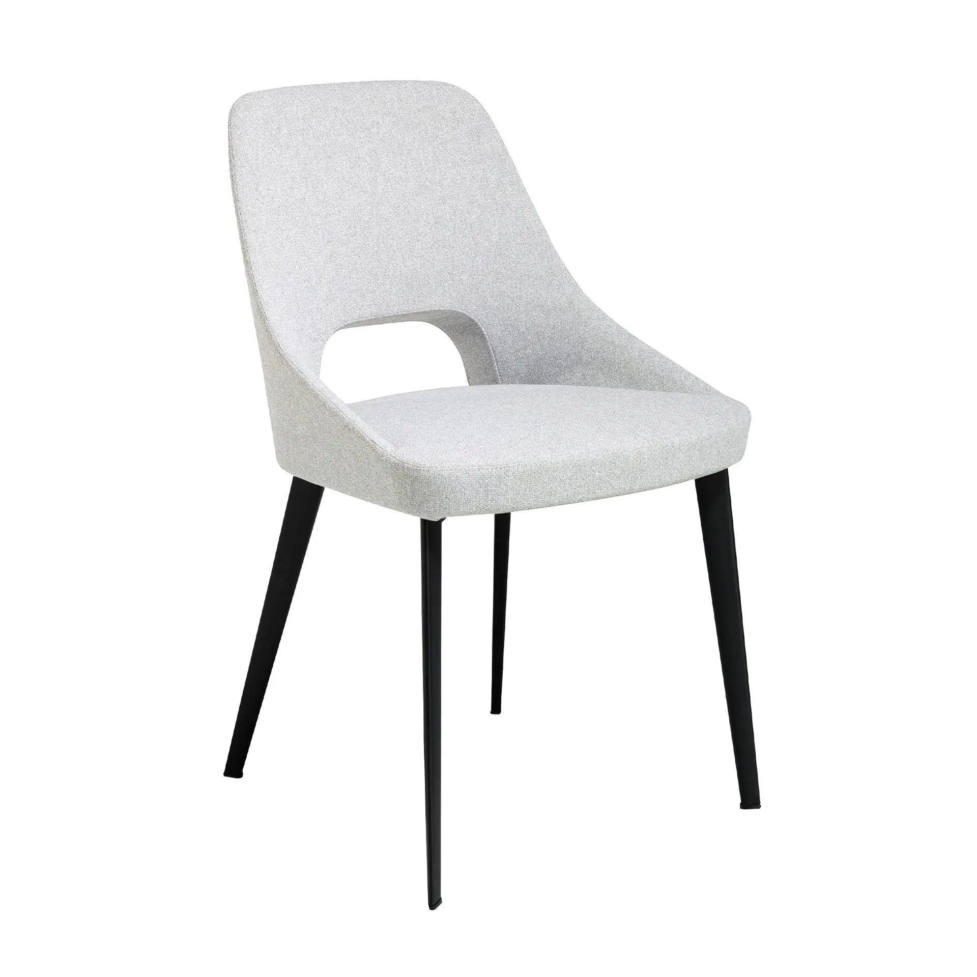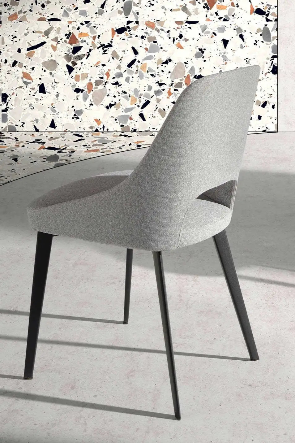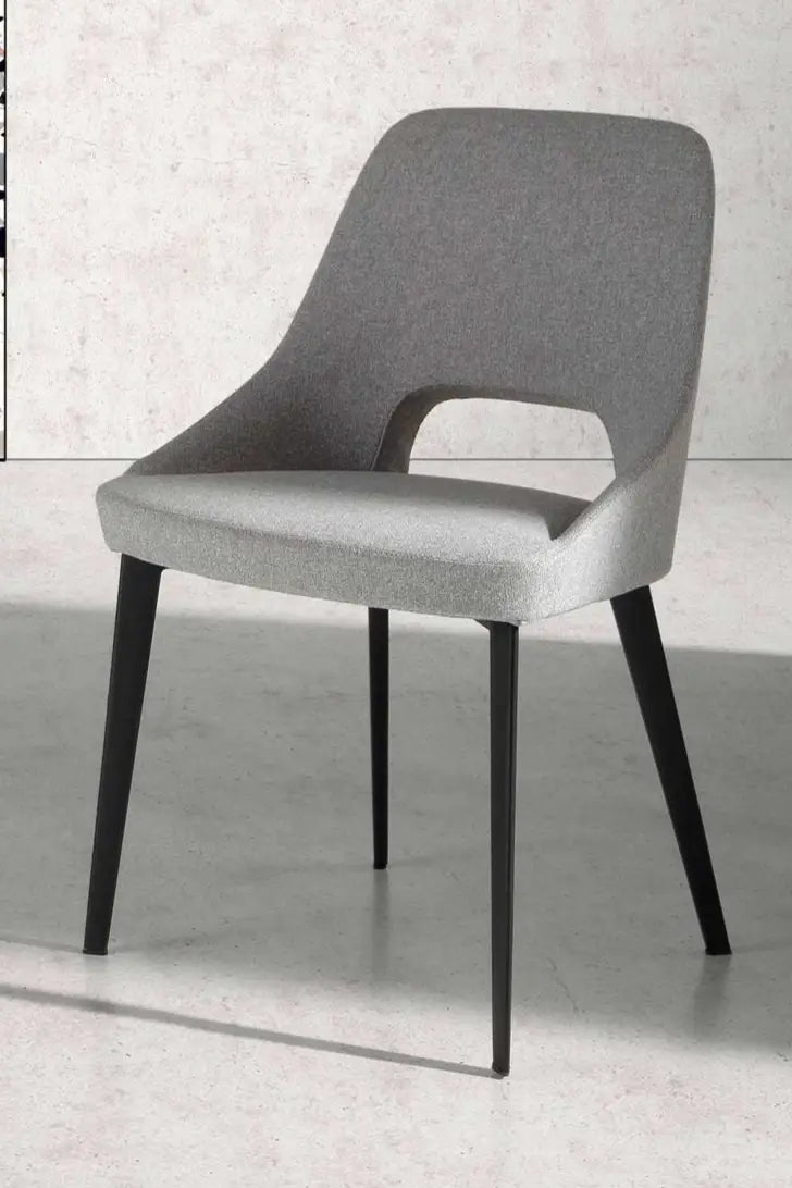 Silla de comedor moderna tapizada en tela gris con patas de acero negro. Su diseño elegante y atemporal aporta un aire sofisticado y distintivo, mientras que el asiento acolchado en espuma de alta densidad y el respaldo envolvente ofrecen máximo confort.