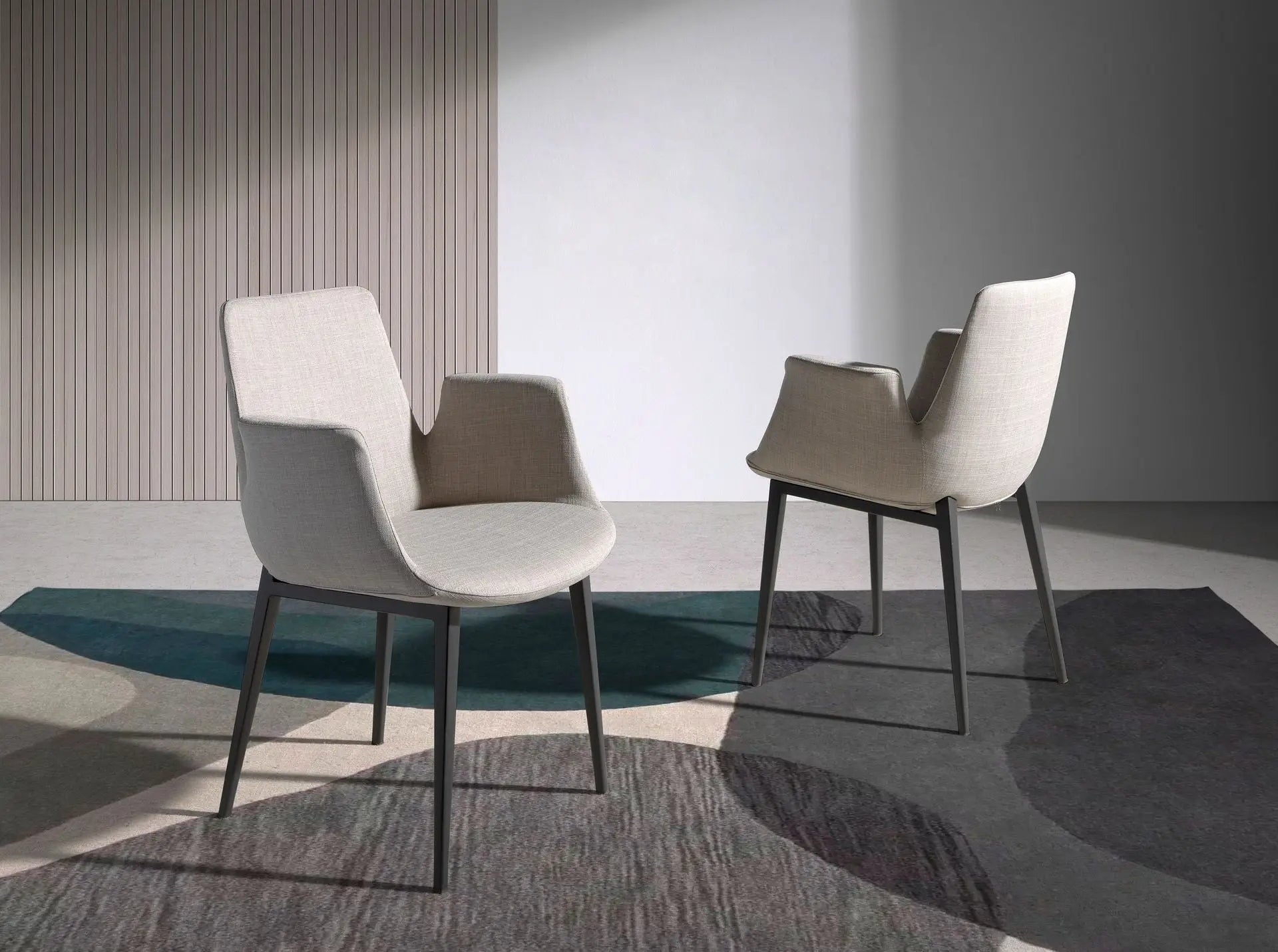 Silla de comedor moderna tapizada en tela gris con reposabrazos y patas de acero negro. Su diseño atemporal aporta elegancia y distinción, mientras que el asiento acolchado en espuma de alta densidad y el respaldo ergonómico garantizan el máximo confort.