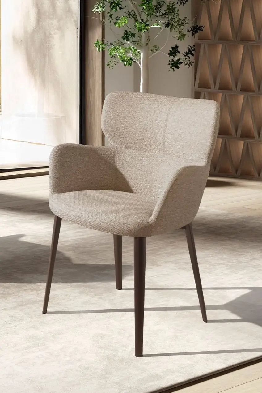 Silla de diseño moderno con reposabrazos, tapizada en tela color marrón jaspeada y patas de acero inoxidable marrón metal que aportan un estilo cálido, vanguardista y atemporal. Su asiento amplio con espuma de poliuretano de 25kg/m³ y respaldo cómodo garantizan el máximo confort, mientras que su diseño elegante la convierte en una pieza clave para salones, comedores o cocinas sofisticadas.
