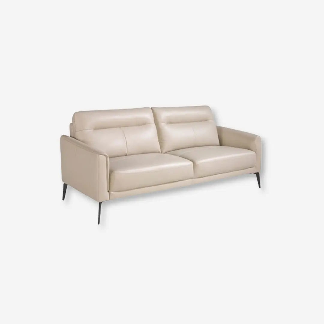 Sofá de 2 plazas de diseño moderno tapizado en piel de origen vacuno color gris beige. Tanto por su estilo, como por sus patas de acero inoxidable pintado en epoxi negro, este sofá aportará el toque de vanguardia y elegancia que busca para su hogar.